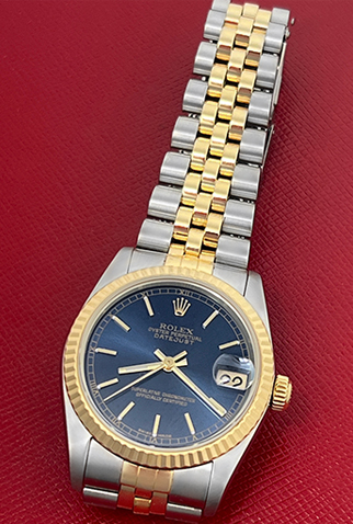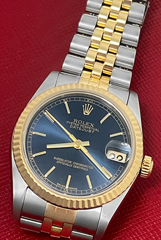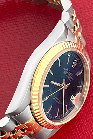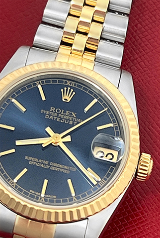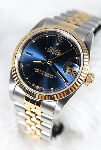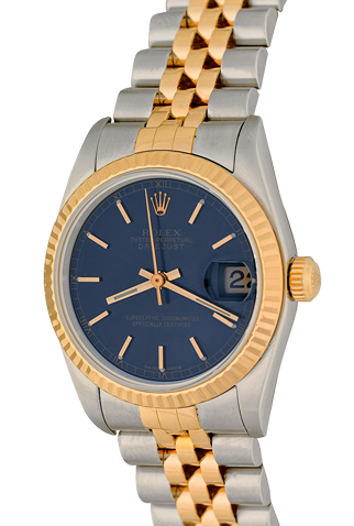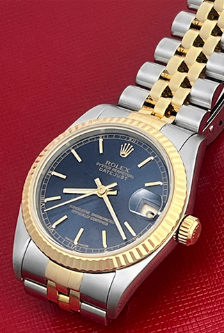 Case Material: Stainless Steel case with 18k Yellow Gold fluted bezel (31mm dia.)