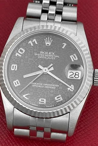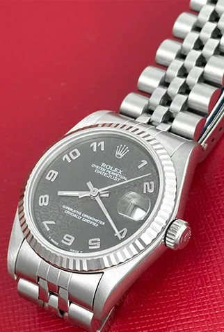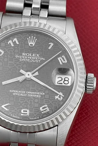 Dial: Slate gray Rolex Jubilee Dial with polished Arabic numerals
