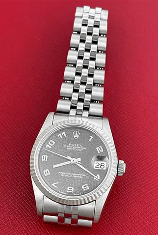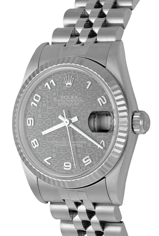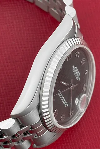 Case Material: Stainless Steel case with 18k White Gold fluted bezel (31mm dia.)