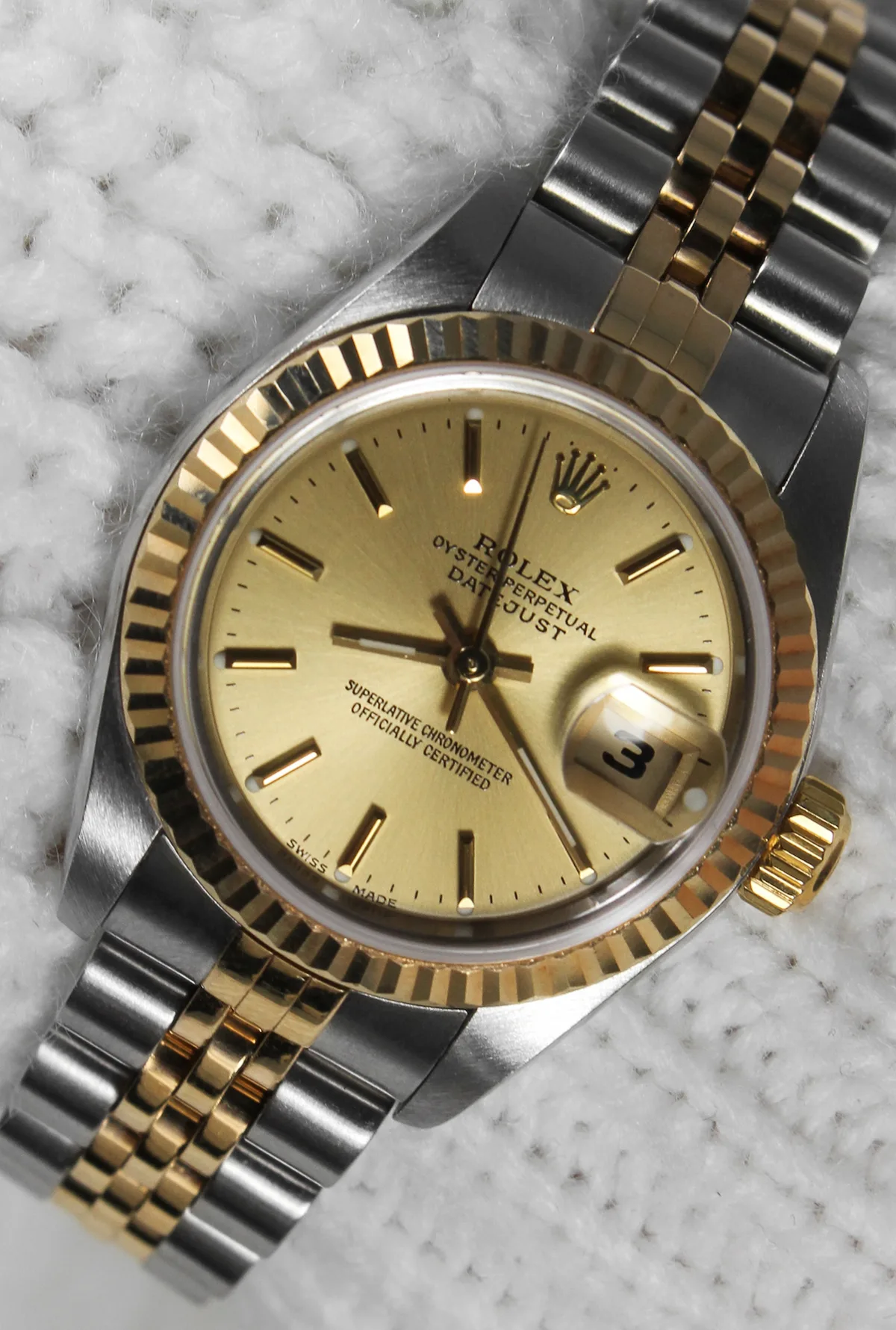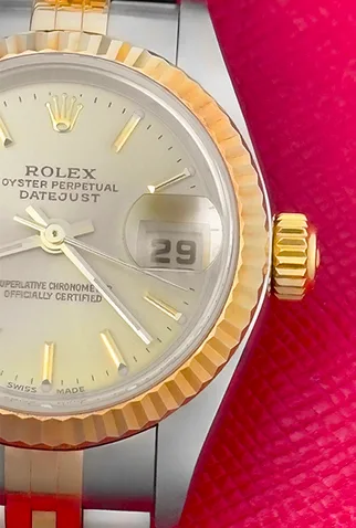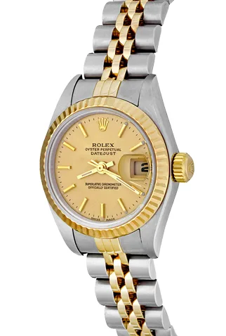 Case Material: Stainless Steel case with 18k Yellow Gold fluted bezel (26mm dia.)