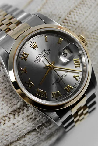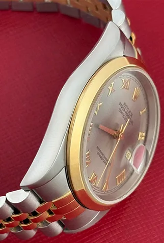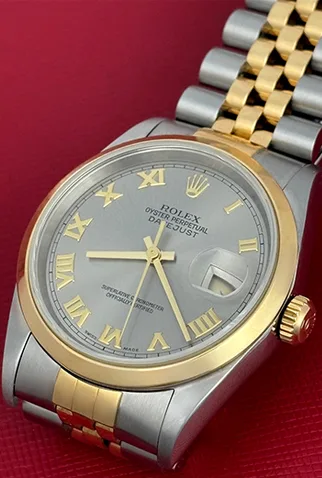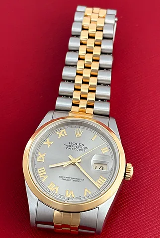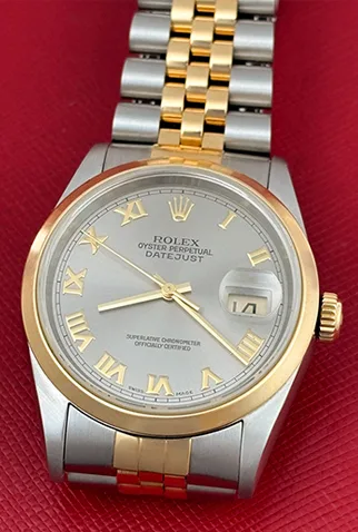 Case Material: Stainless Steel case with 18k Yellow Gold smooth bezel (36mm dia.)