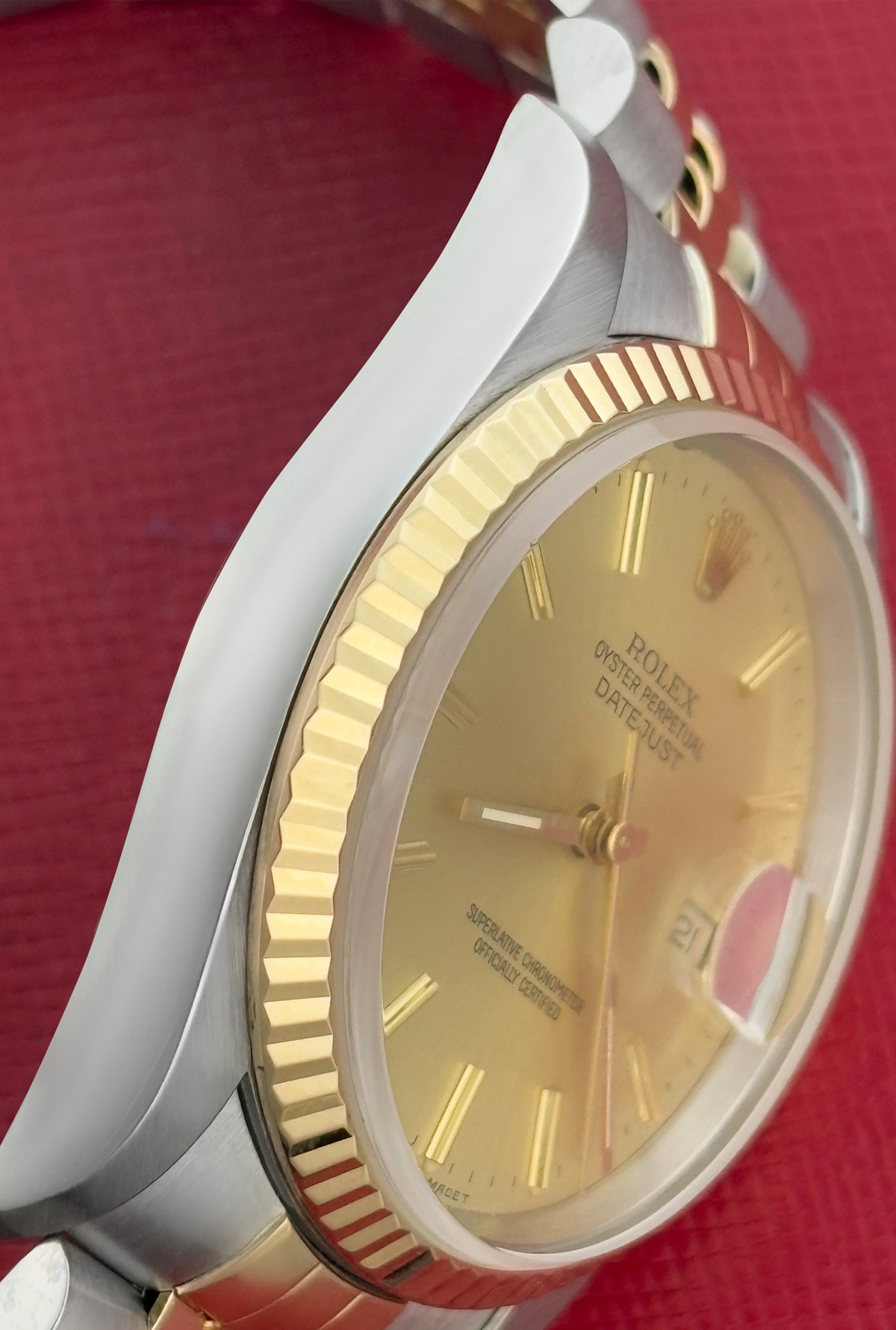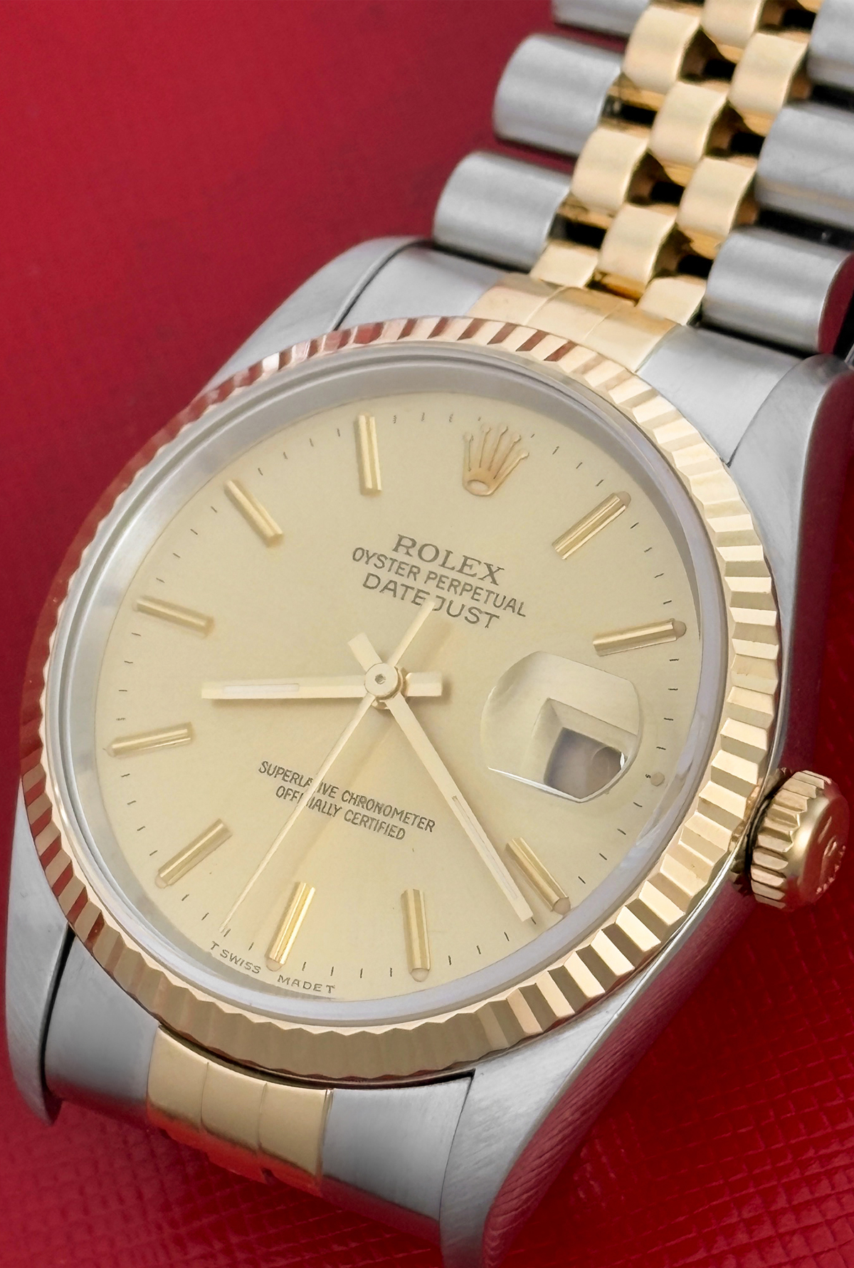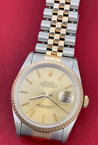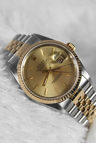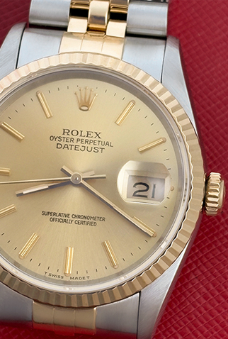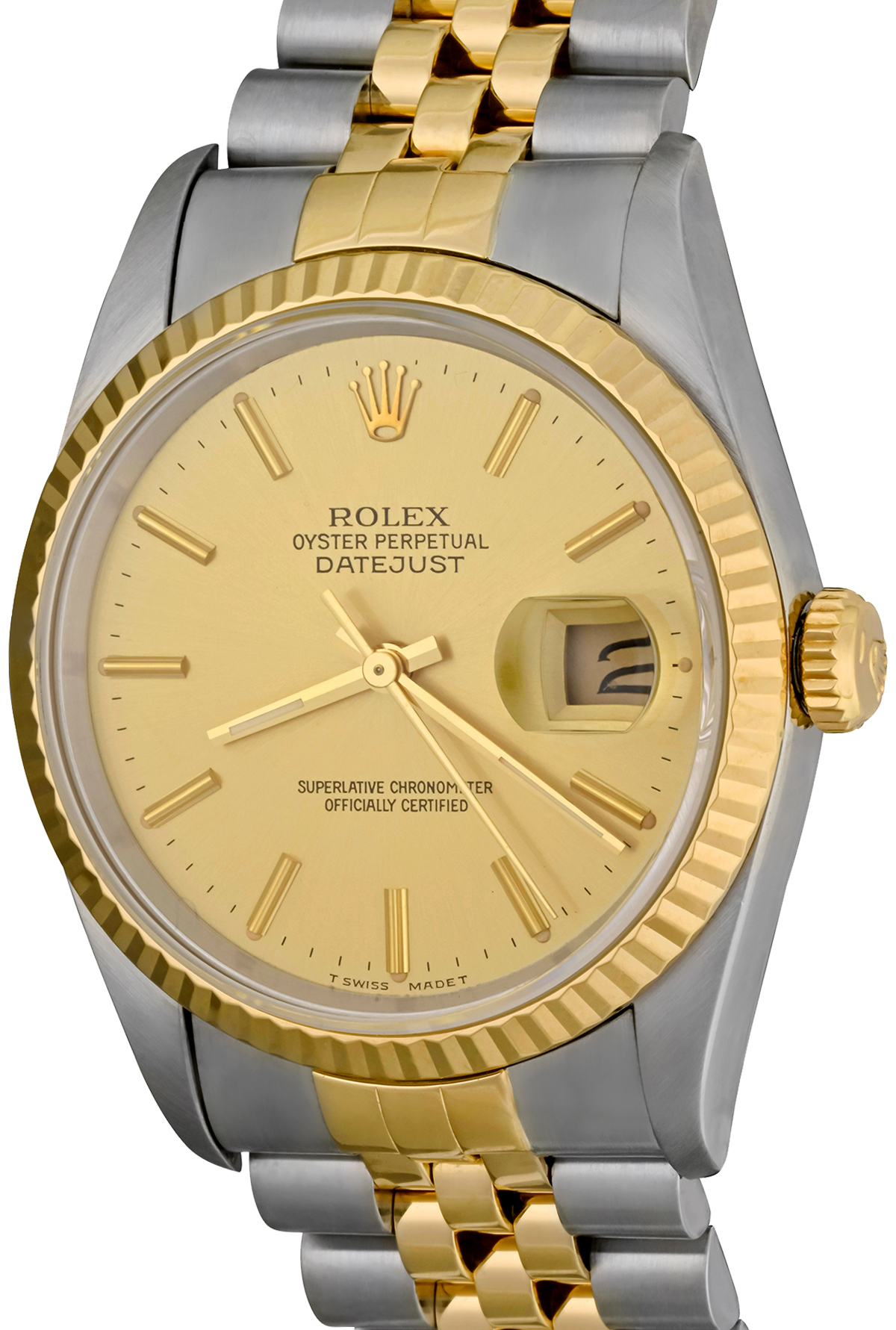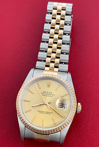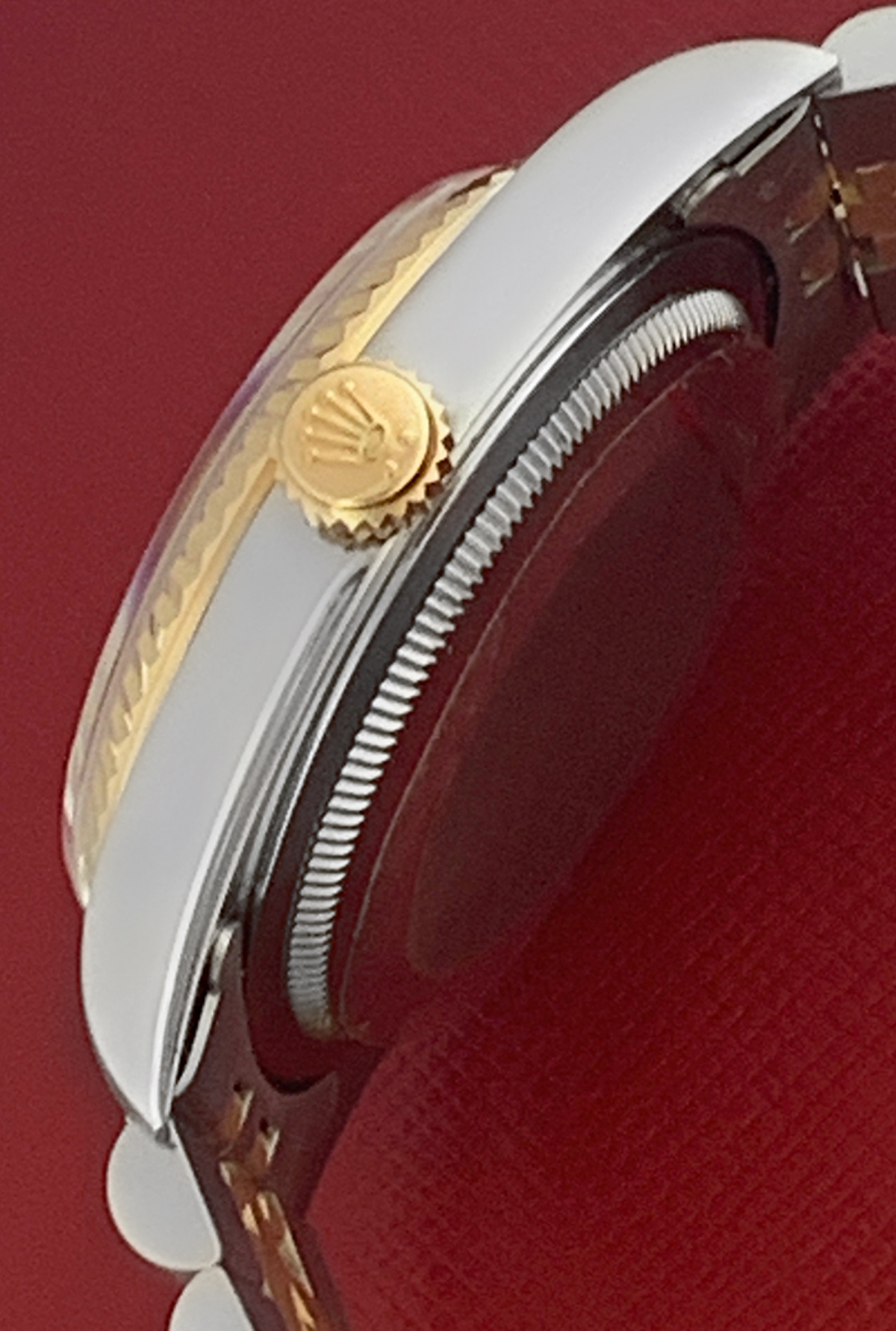 Case Material: Stainless Steel case with 18k Yellow Gold fluted bezel (36mm dia.)