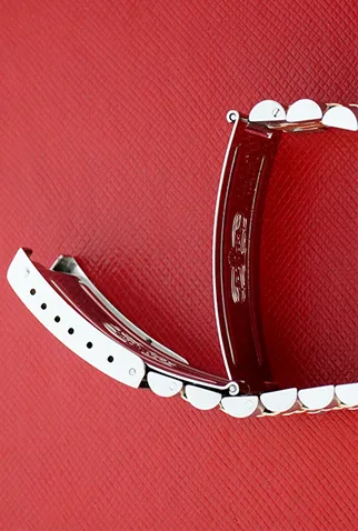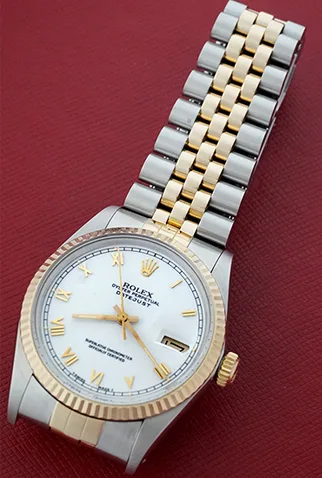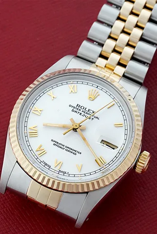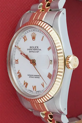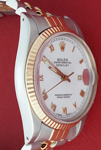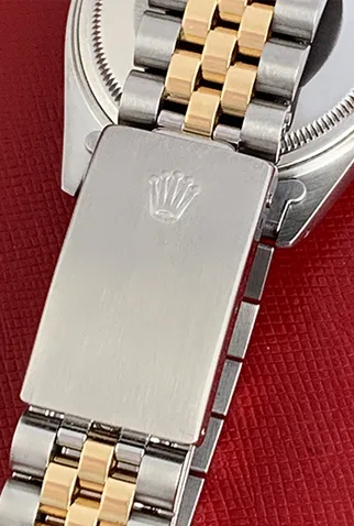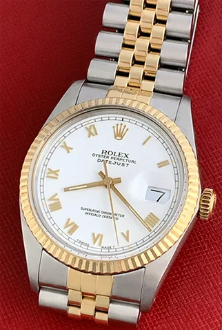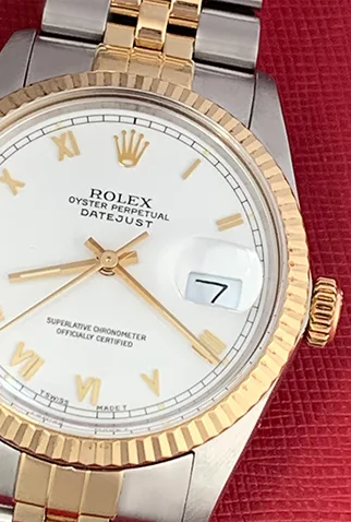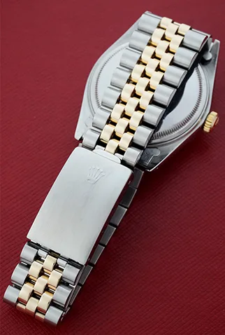 Case Material: Stainless Steel case with 18k Yellow Gold fluted bezel (36mm dia.)
