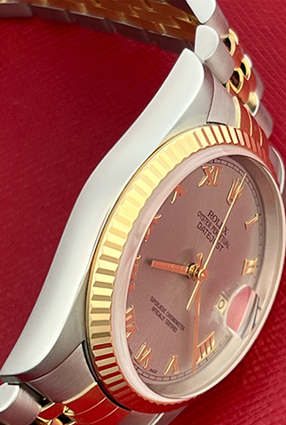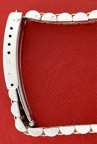 Case Material: Stainless Steel case with 18k Yellow Gold fluted bezel (36mm dia.)