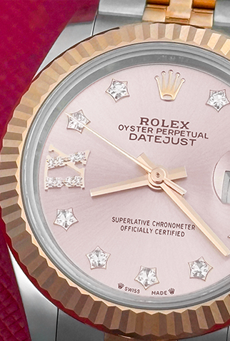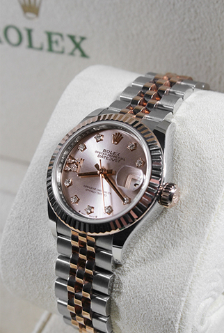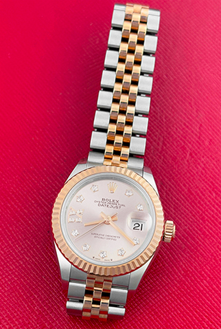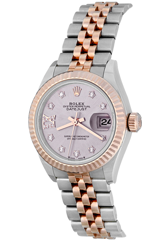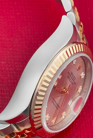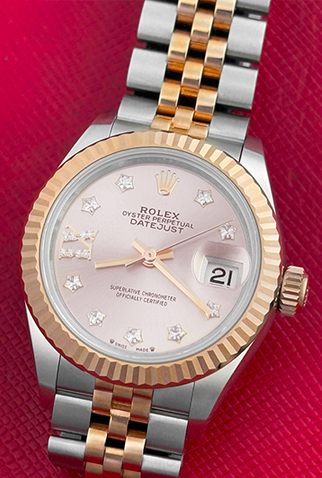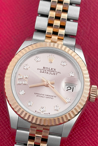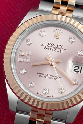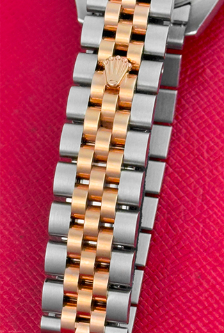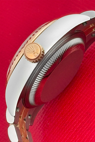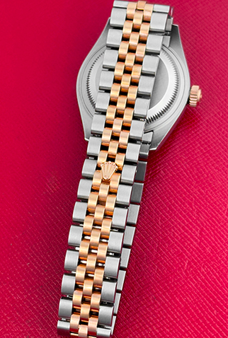 Case Material: Stainless Steel case with 18k Rose Gold fluted bezel (28mm dia.)