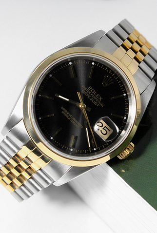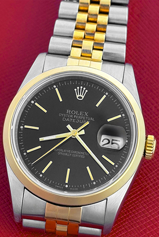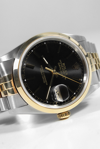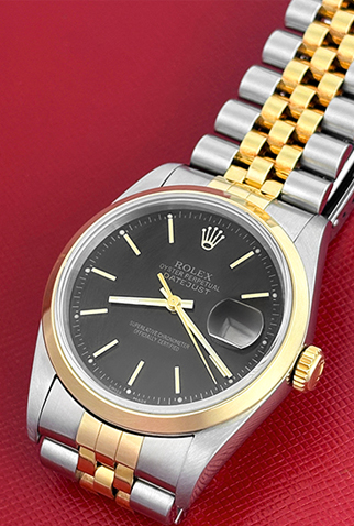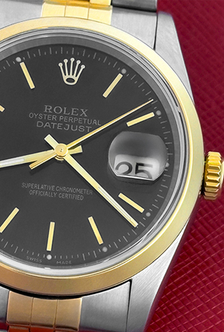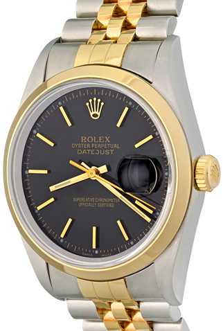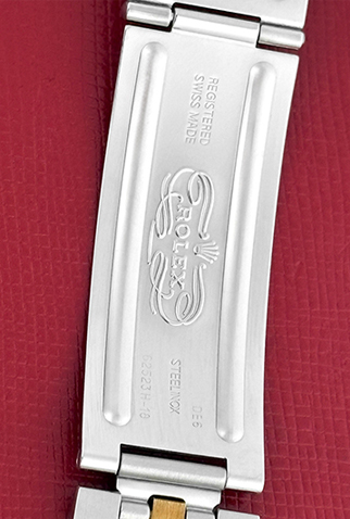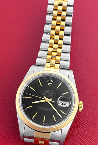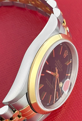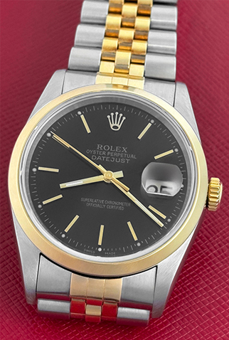 Case Material: Stainless Steel case with 18k Yellow Gold smooth bezel (36mm dia.)
