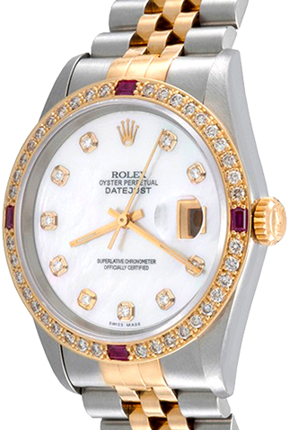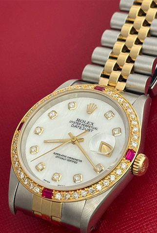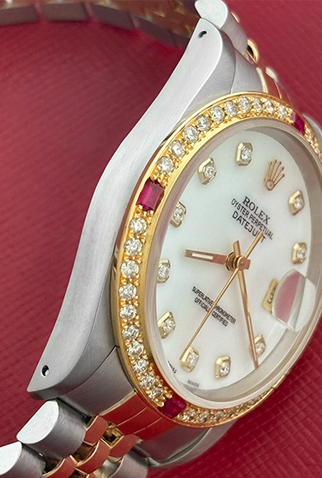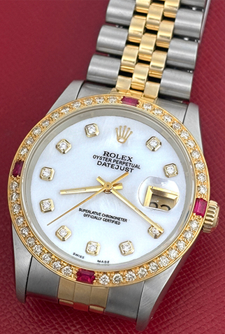 Case Material: Stainless Steel & 18k Yellow Gold Diamond and Ruby bezel (36mm dia.)