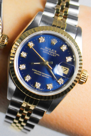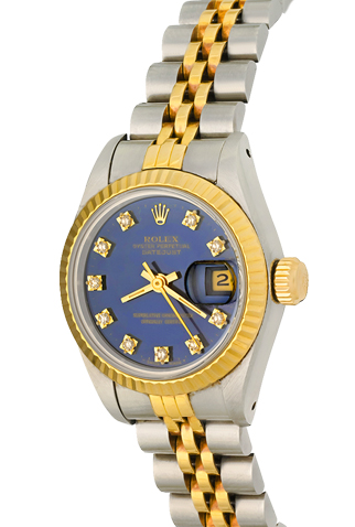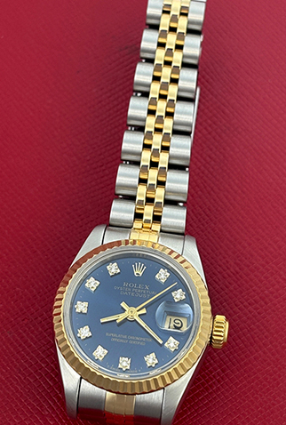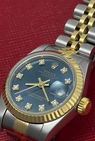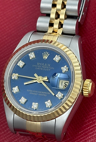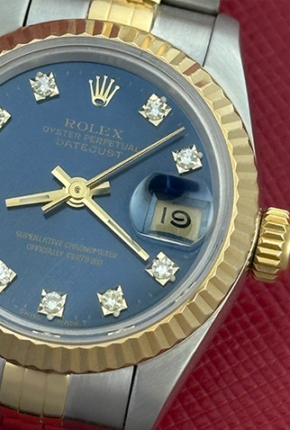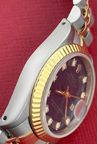 Case Material: Stainless Steel case with 18k Yellow Gold fluted bezel (26mm dia.)
