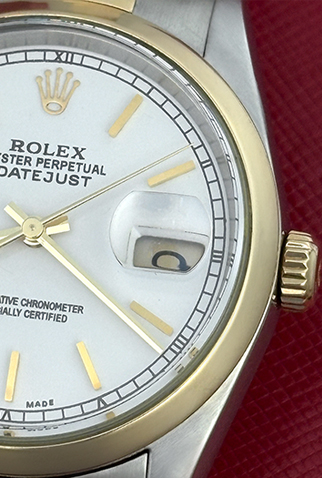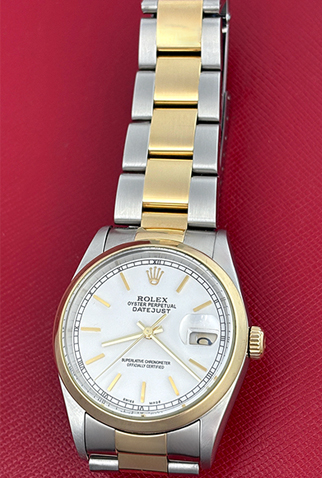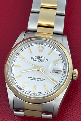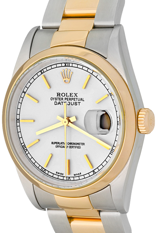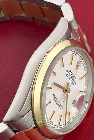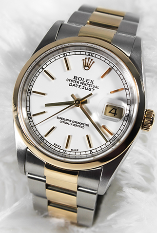 Case Material: Stainless Steel case with 18k Yellow Gold smooth bezel (36mm dia.)