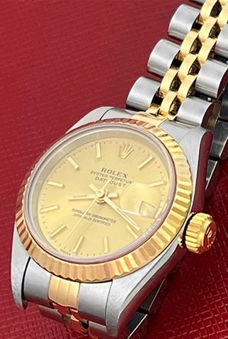 Case Material: Stainless Steel case with 18k Yellow Gold fluted bezel (26mm dia.)