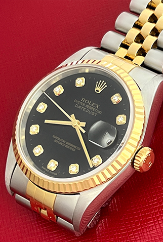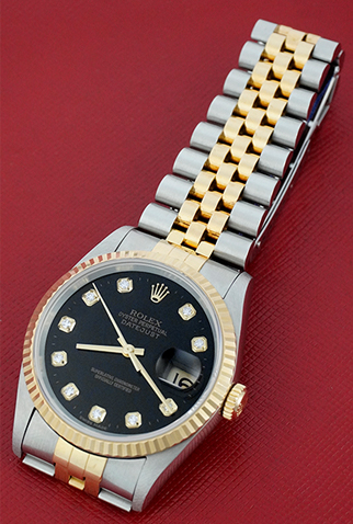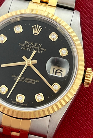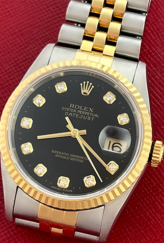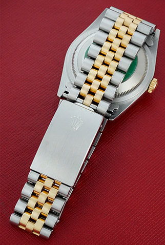 Case Material: Stainless Steel case with 18k Yellow Gold fluted bezel (36mm dia.)