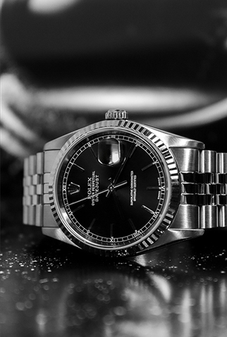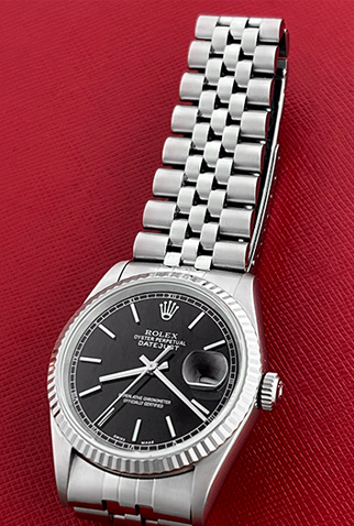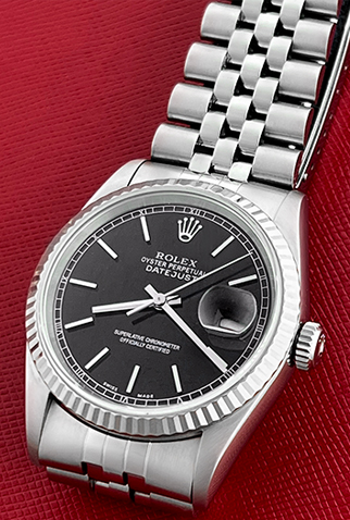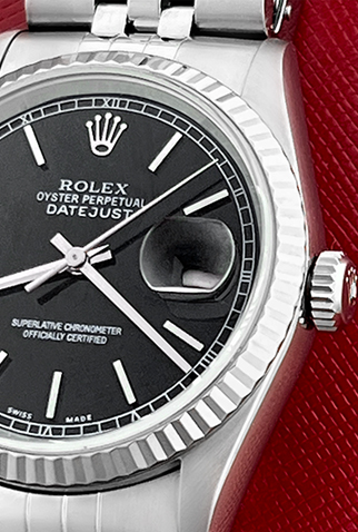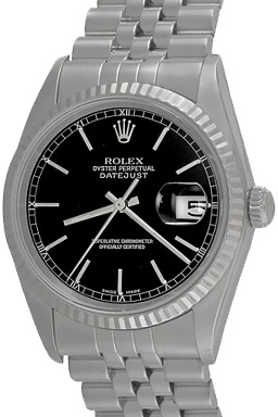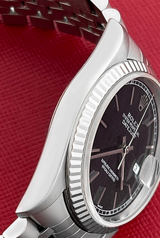 Case Material: Stainless Steel case with 18k White Gold fluted bezel (36mm dia.)