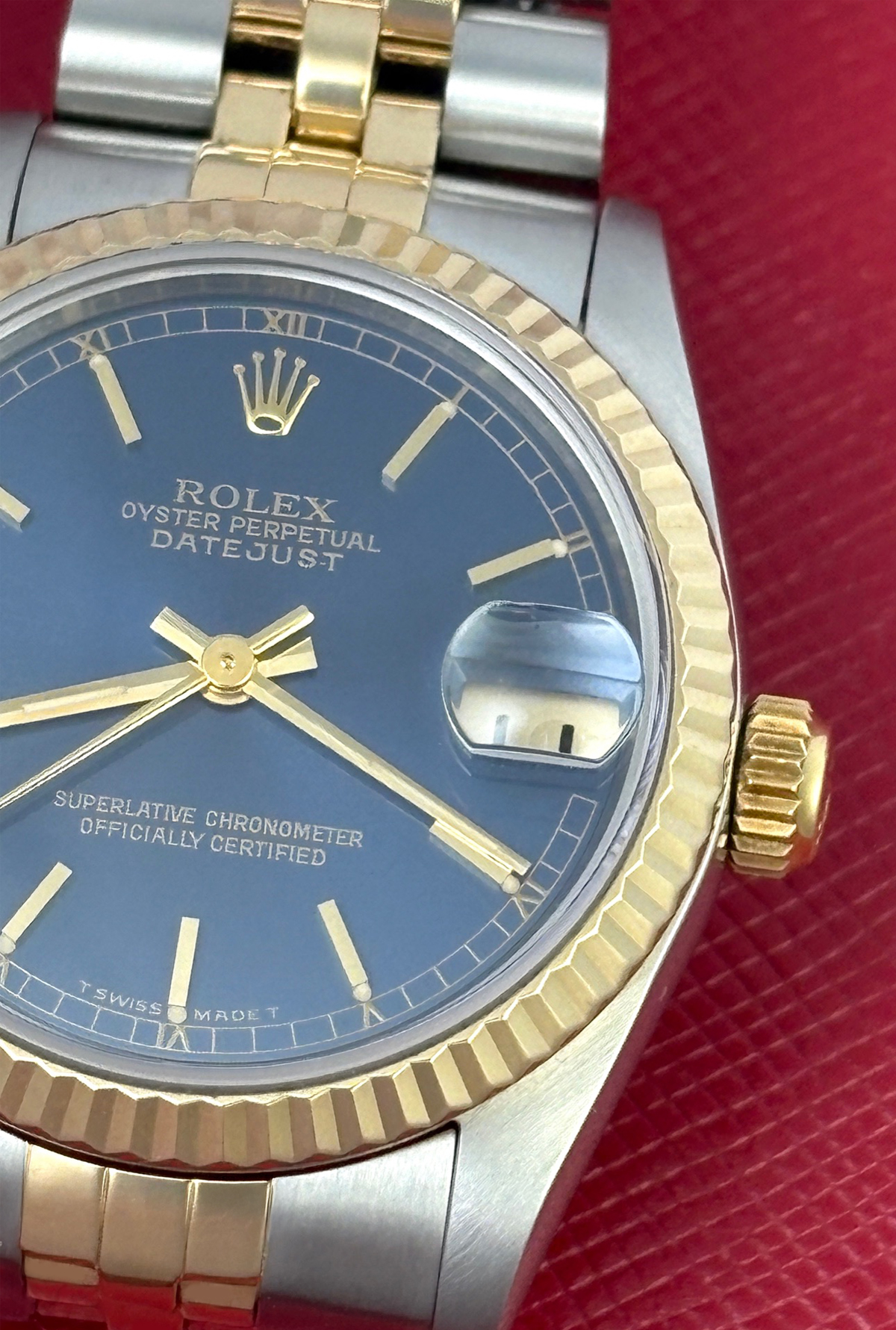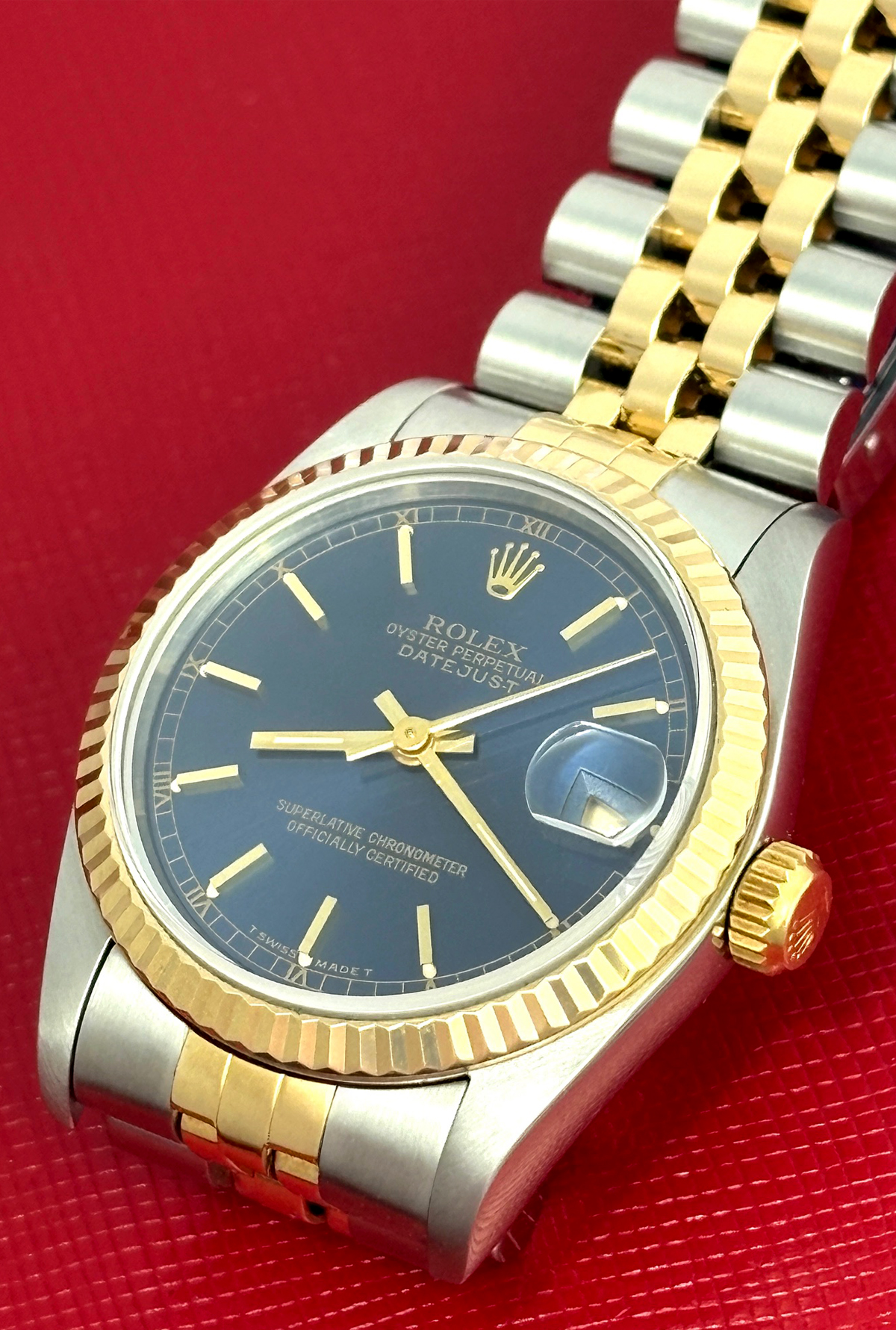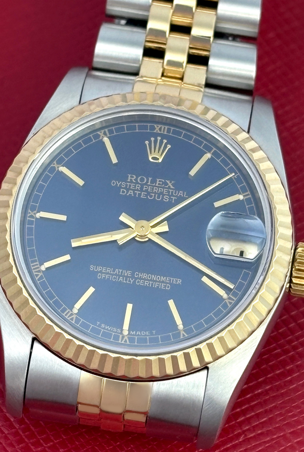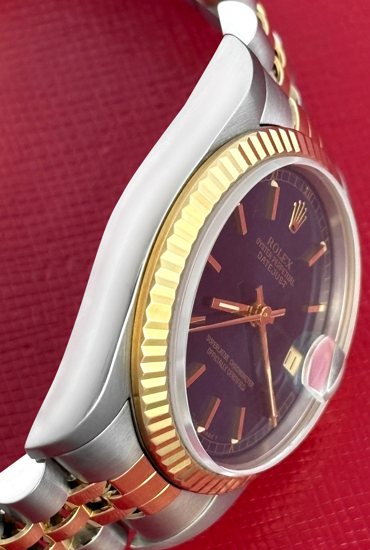 Case Material: Stainless Steel case with 18k Yellow Gold fluted bezel (31mm dia.)