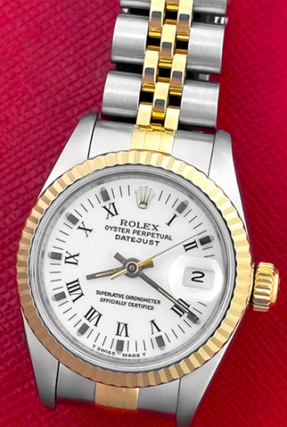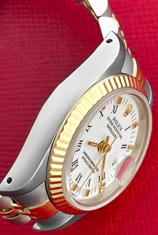 Case Material: Stainless Steel case with 18k Yellow Gold fluted bezel (26mm dia.)