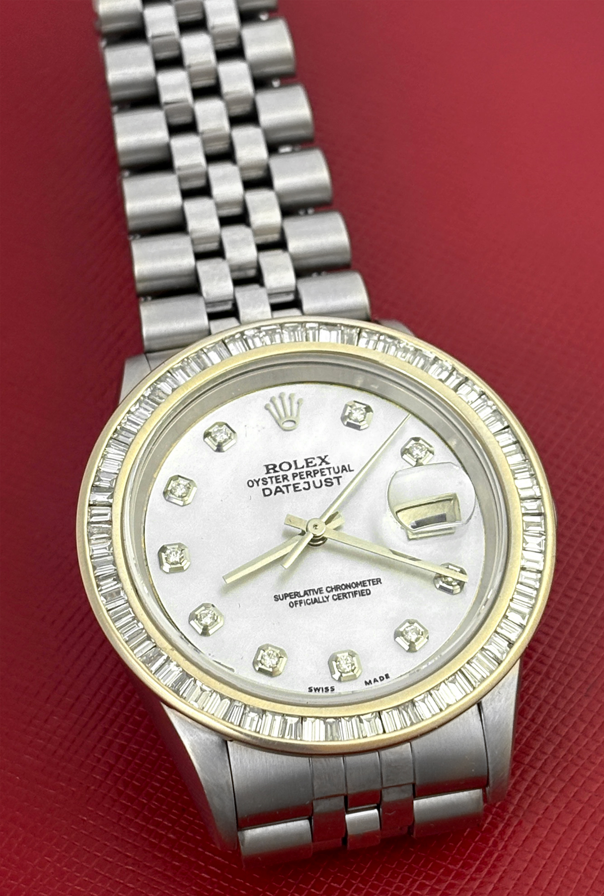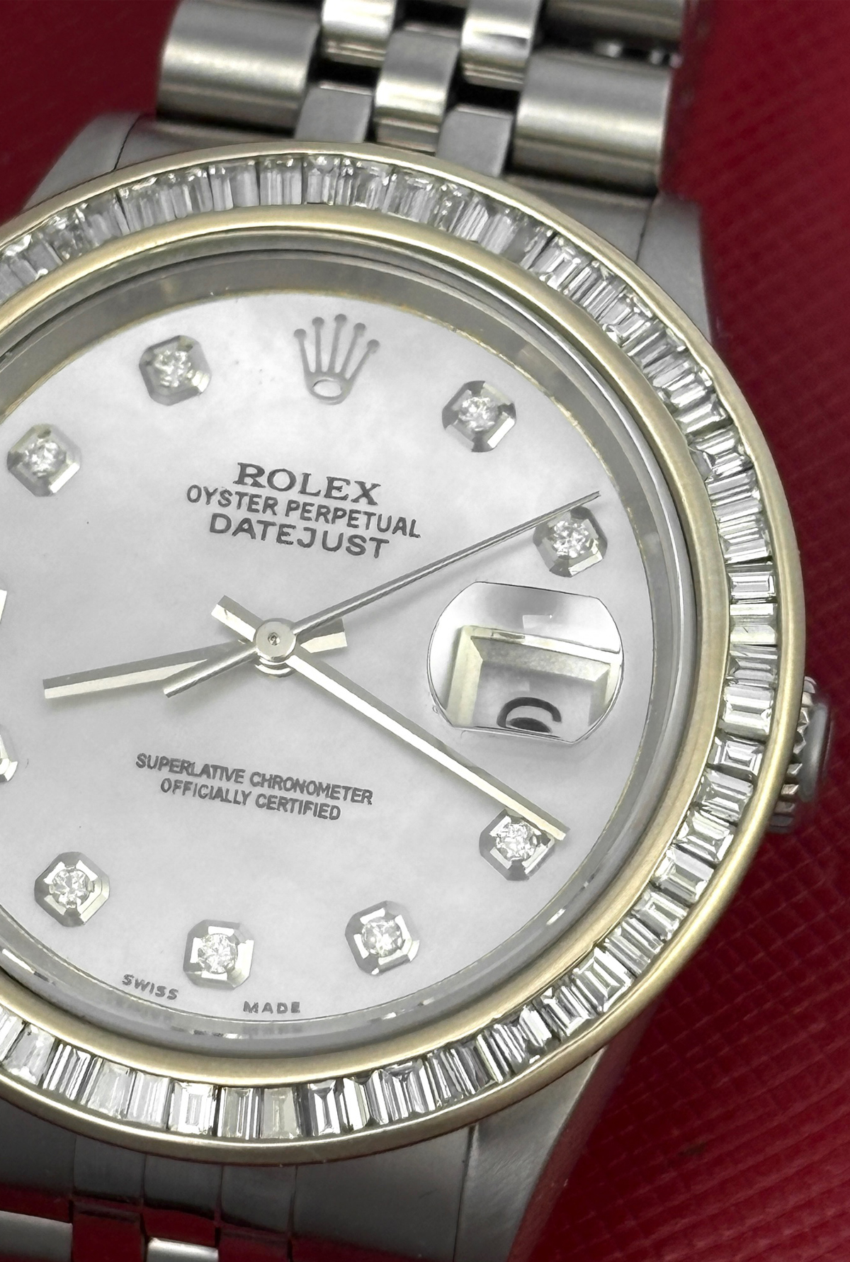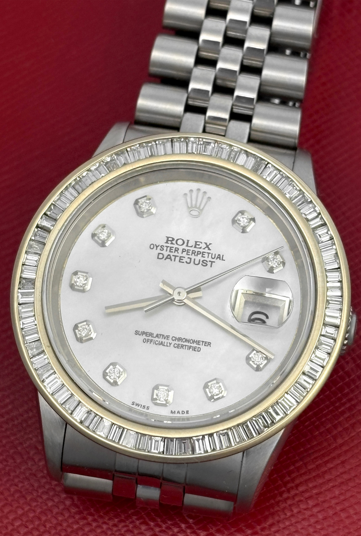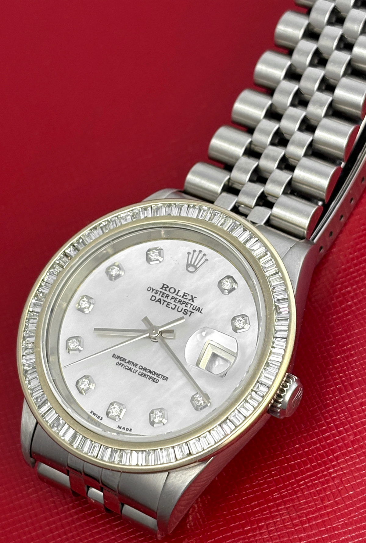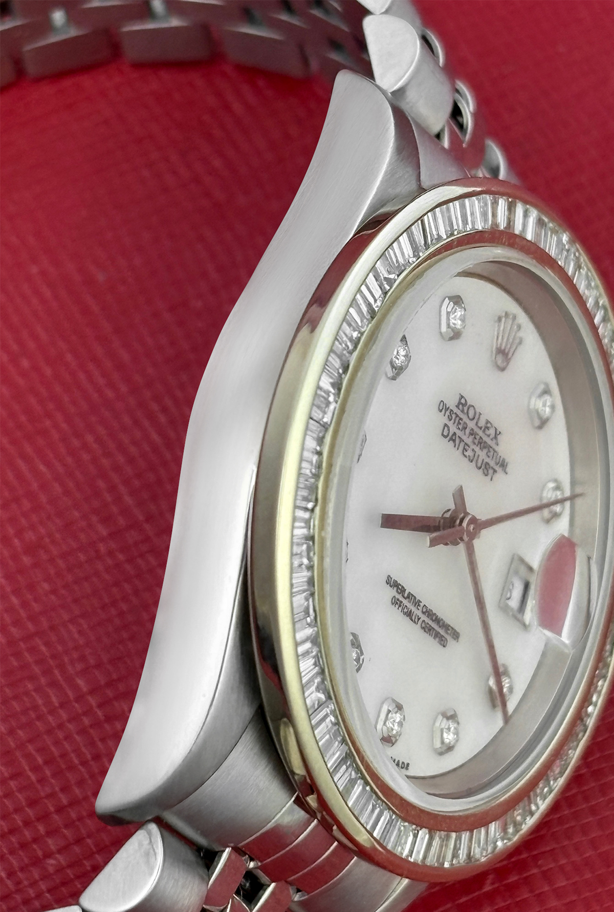 Case Material: Stainless Steel case with custom 2.5 ct. Baguette Diamond bezel (36mm dia.)