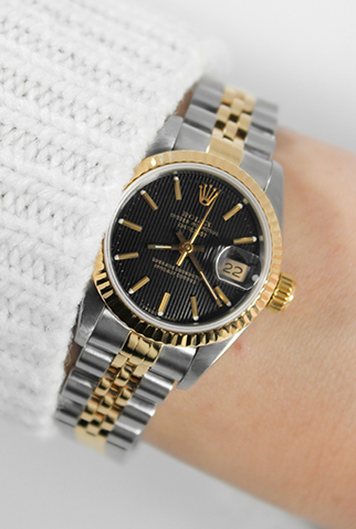 Case Material: Stainless Steel case with 18k Yellow Gold fluted bezel (26mm dia.)