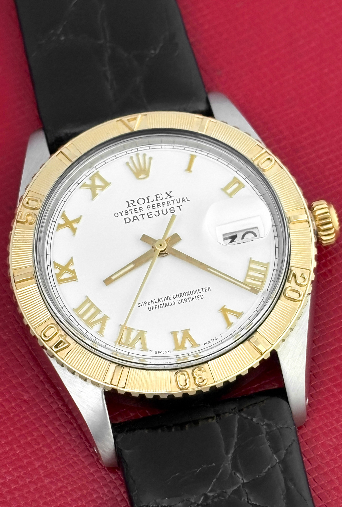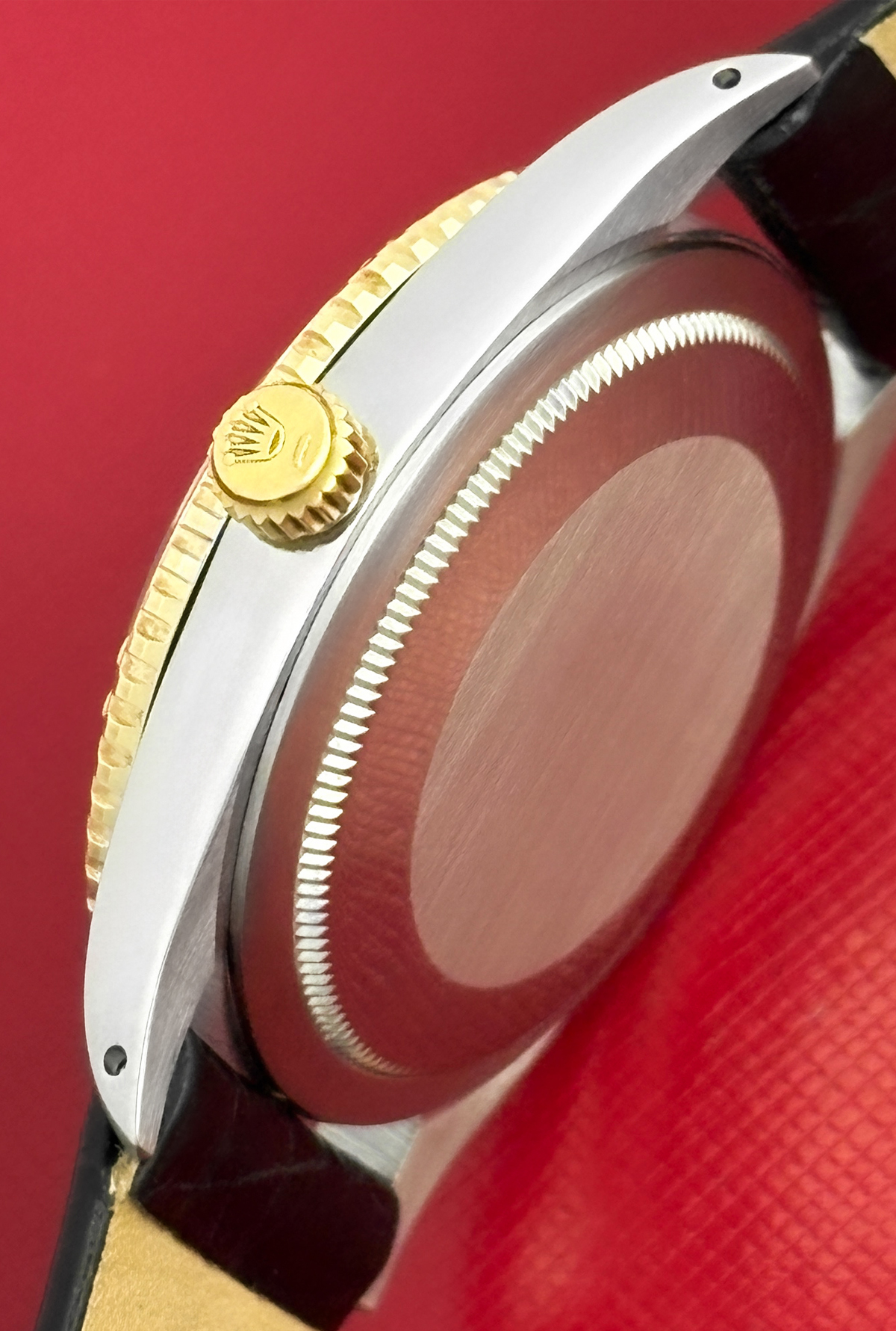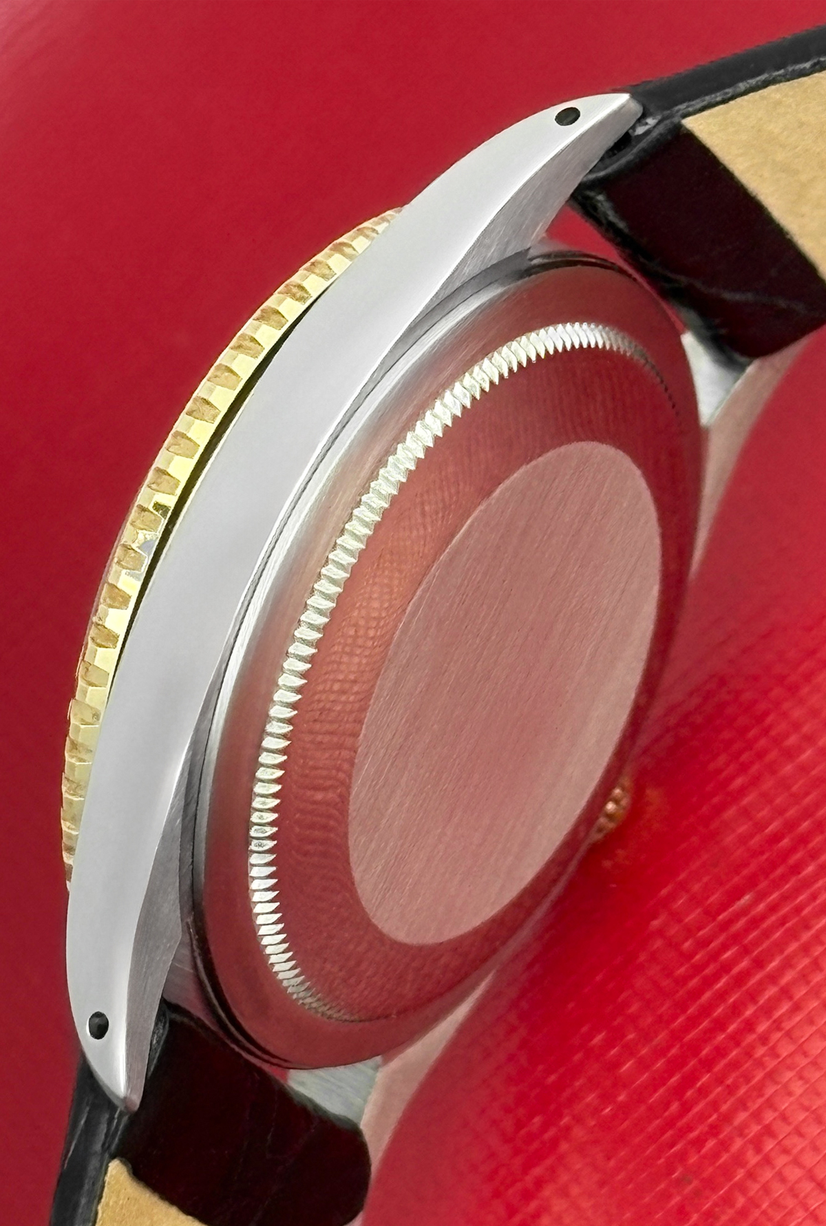 Case Material: Stainless Steel case with 14k Yellow Gold Thunderbird bezel (36mm dia.)