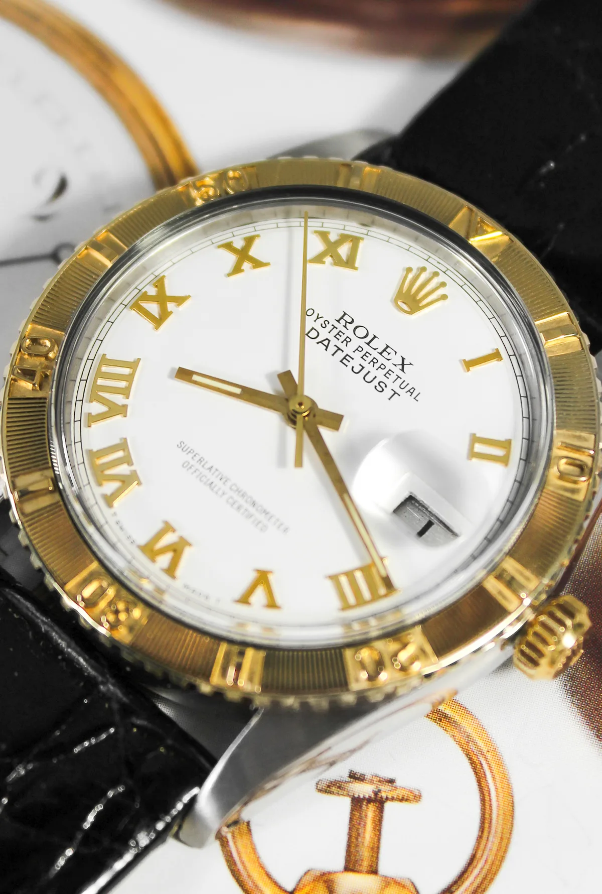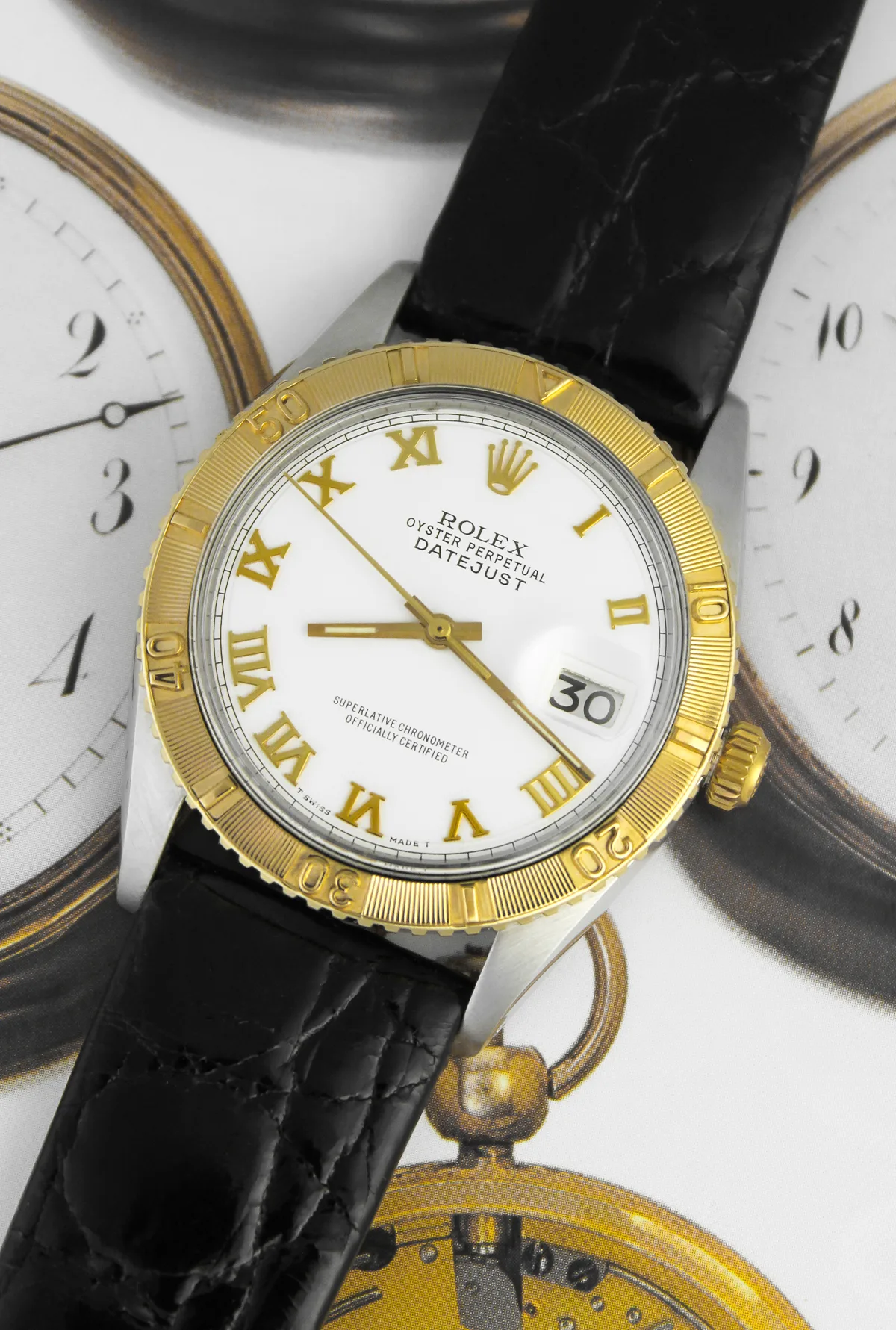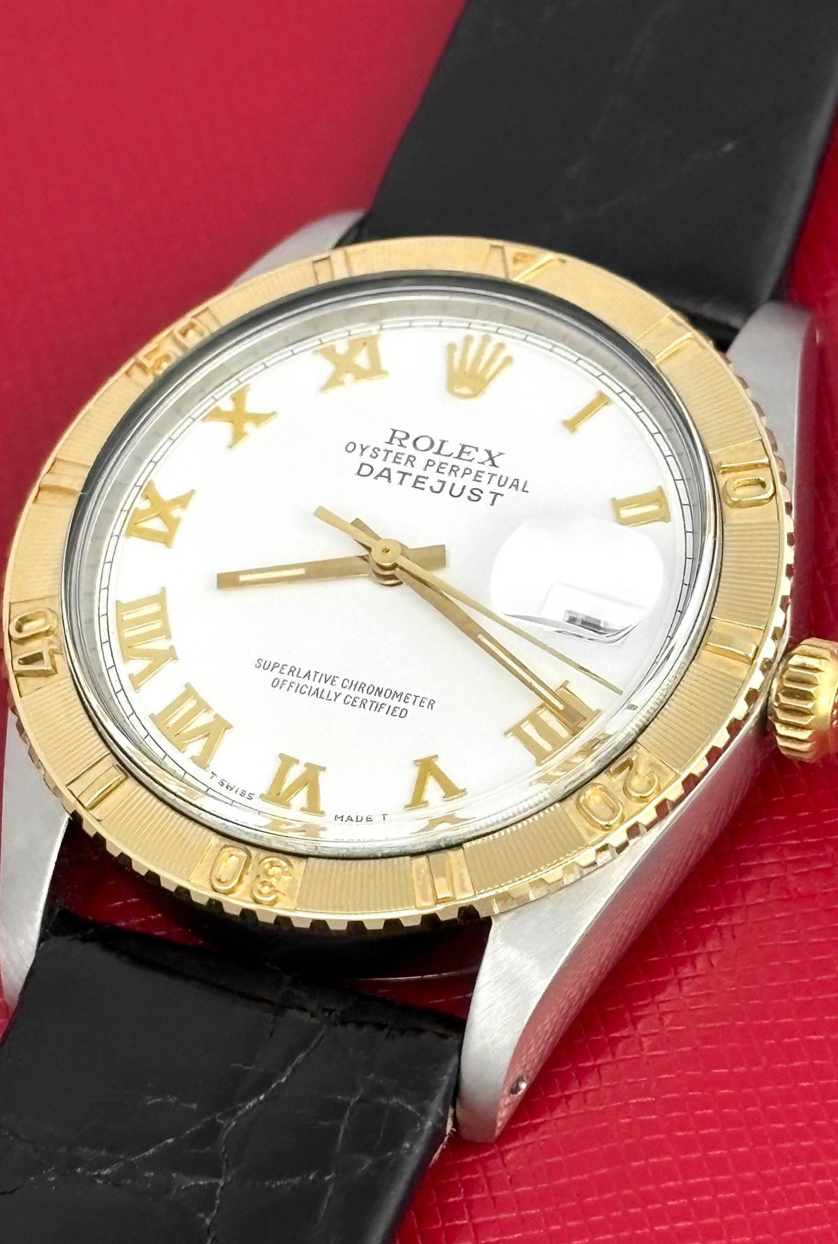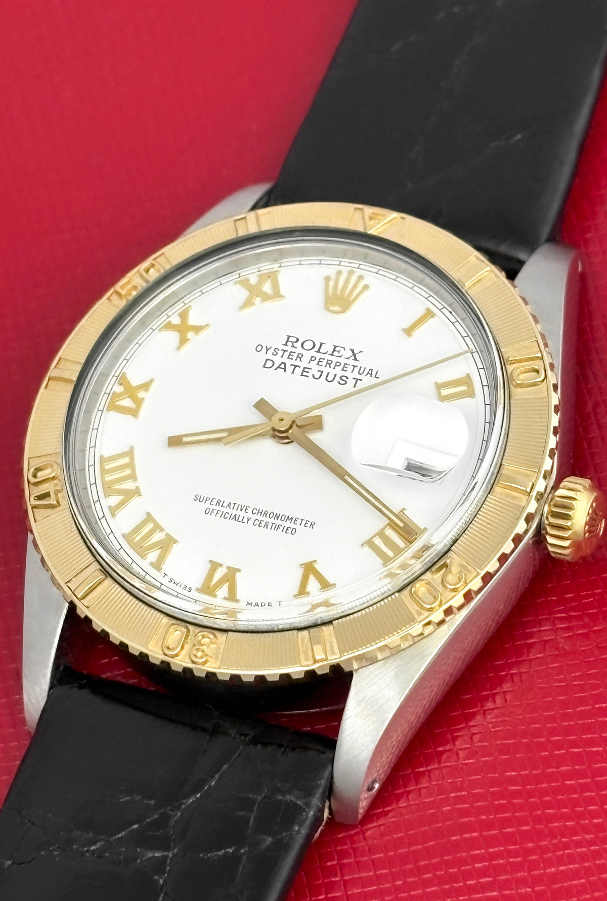 Case Material: Stainless Steel case with 14k Yellow Gold Thunderbird bezel (36mm dia.)