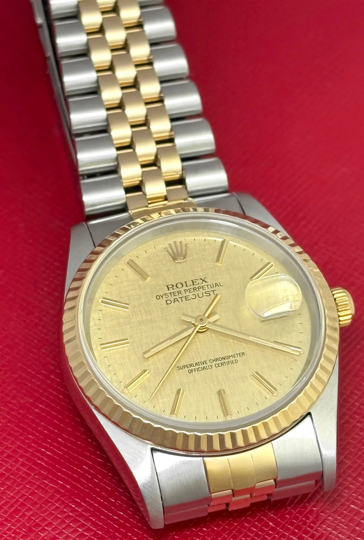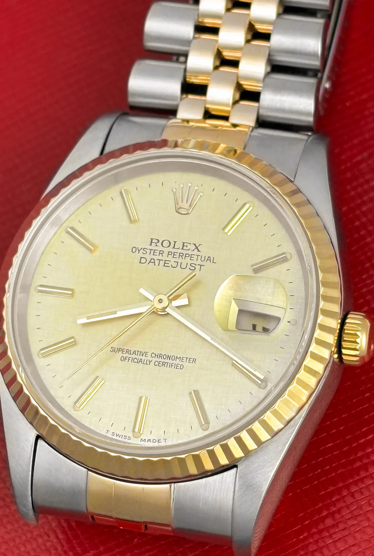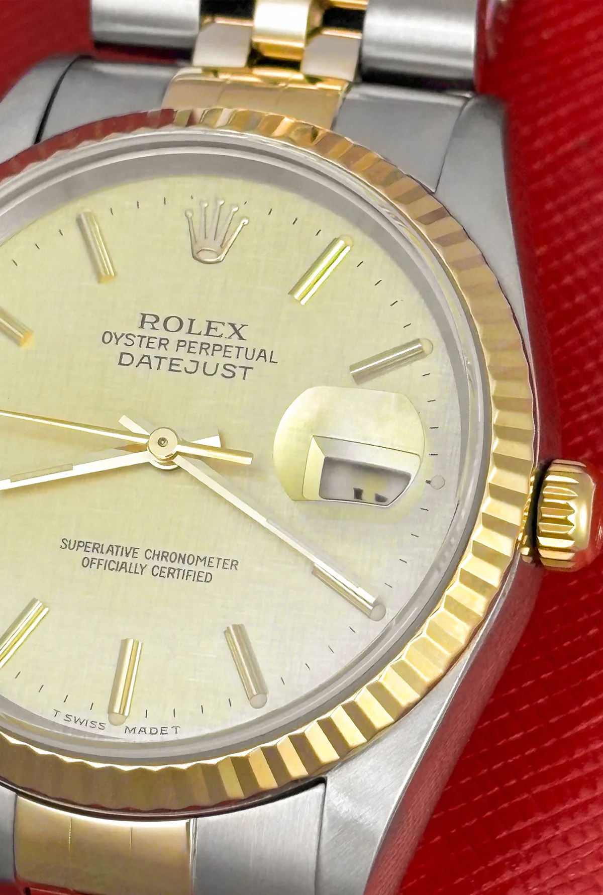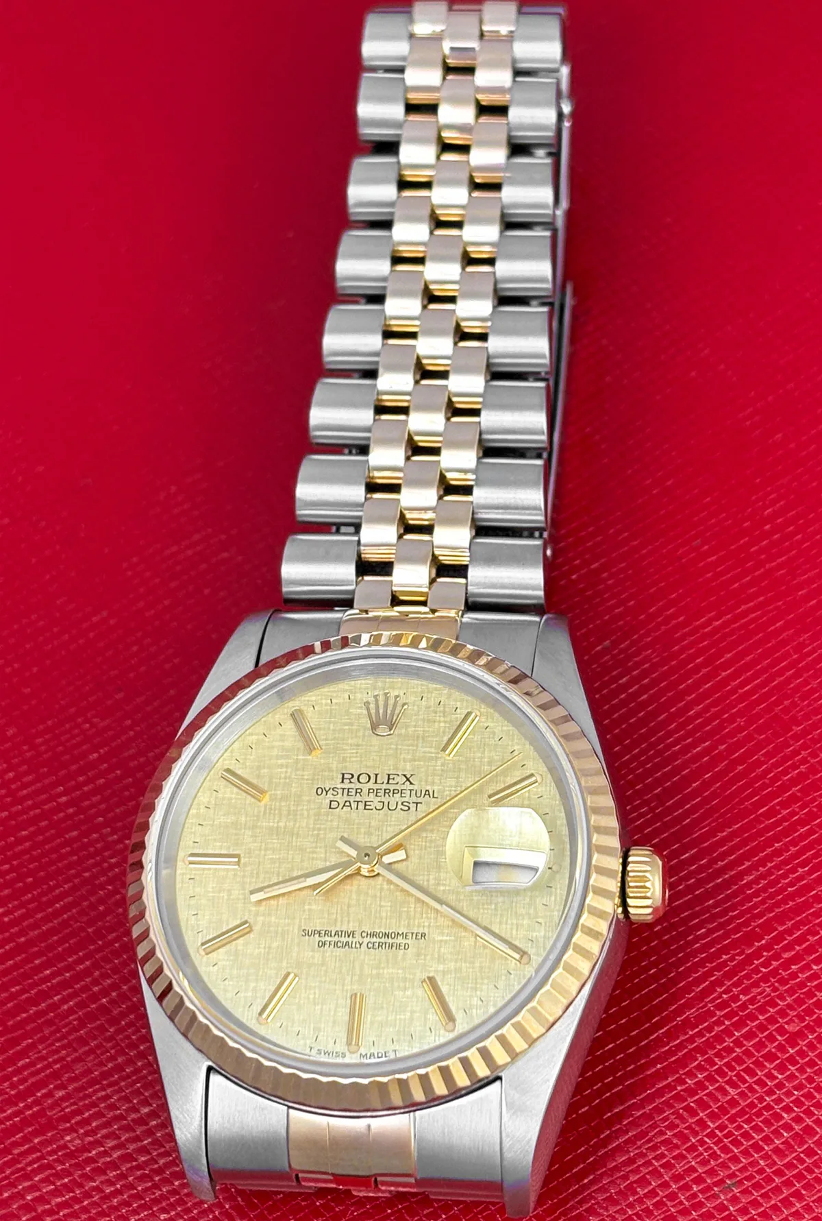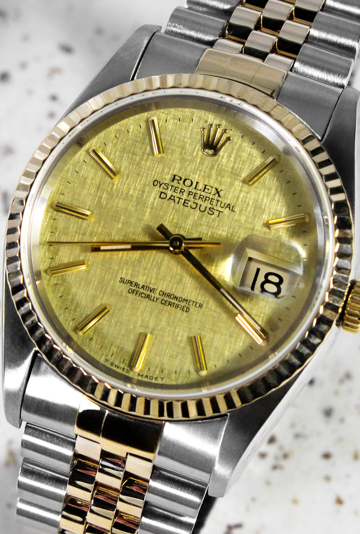 Dial: Champagne Linen pattern Dial with gold hour markers