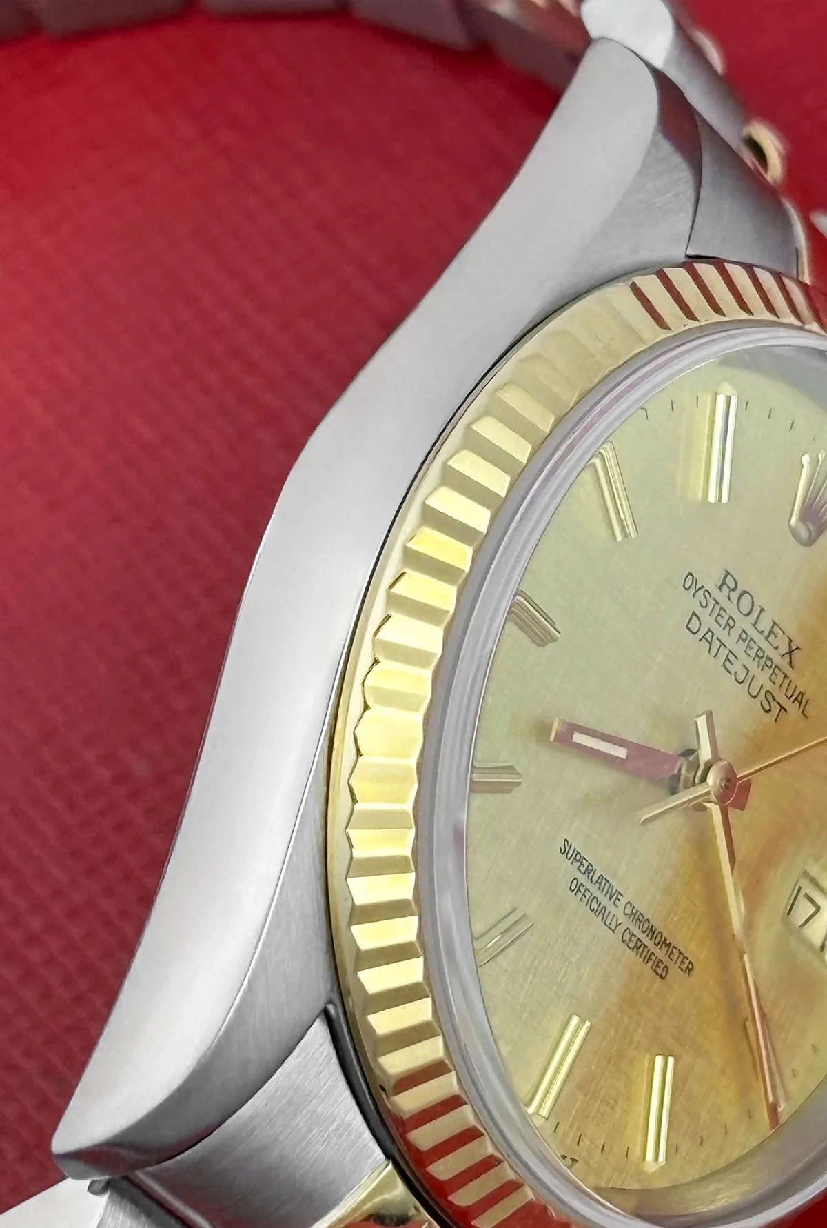 Case Material: Stainless Steel case with 18k Yellow Gold fluted bezel (36mm dia.)