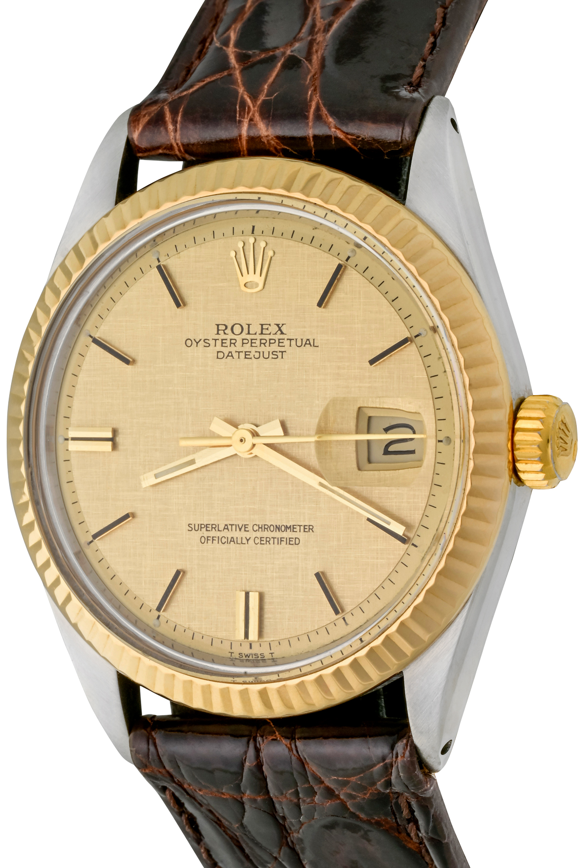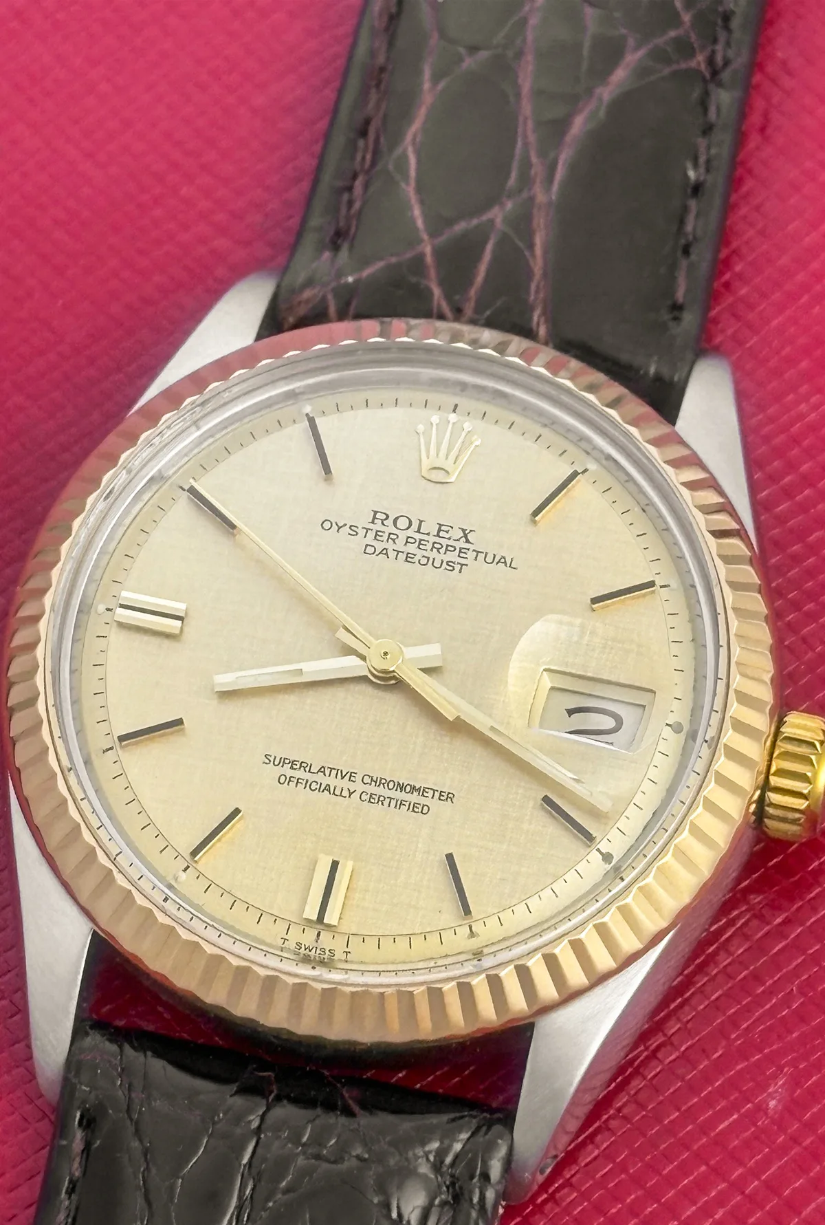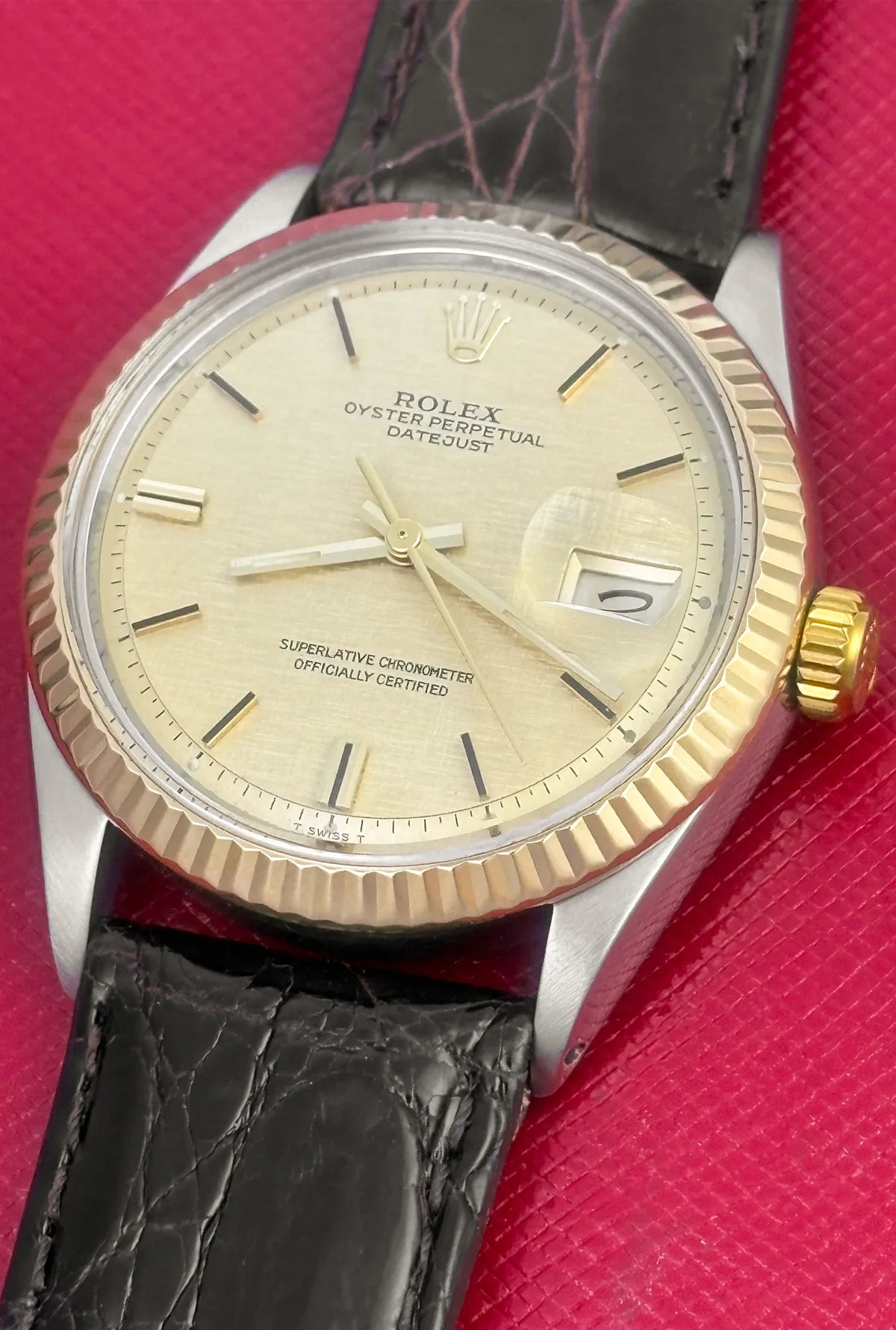 Dial: Champagne Linen Dial with yellow and black gold hour markers
