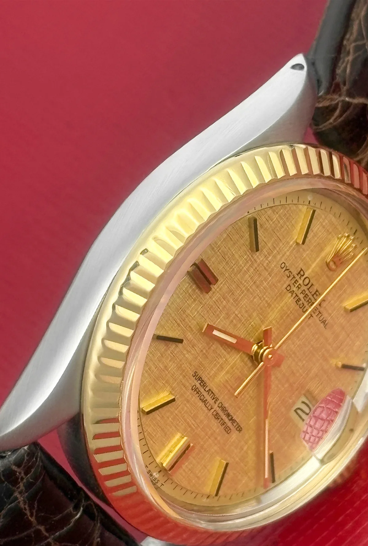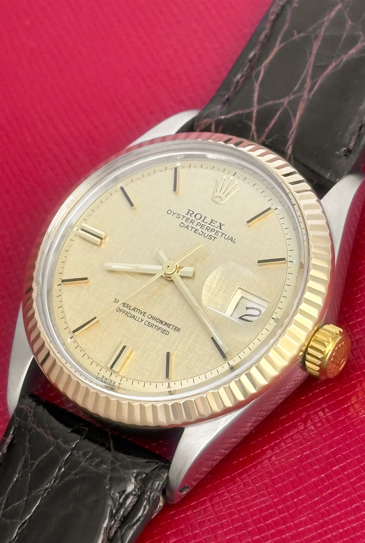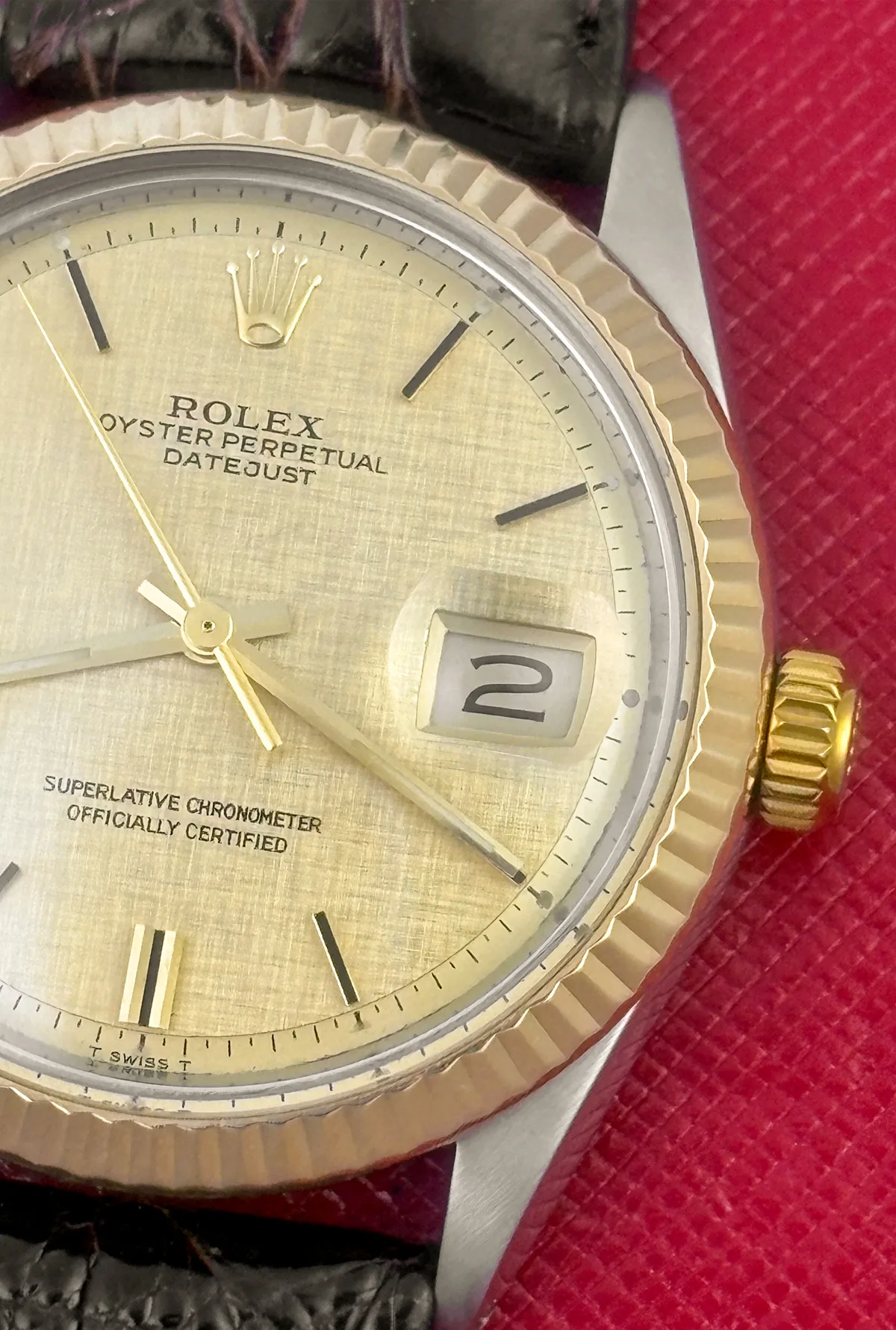 Dial: Champagne Linen Dial with yellow and black gold hour markers