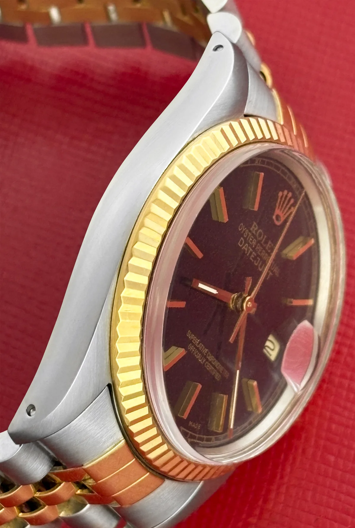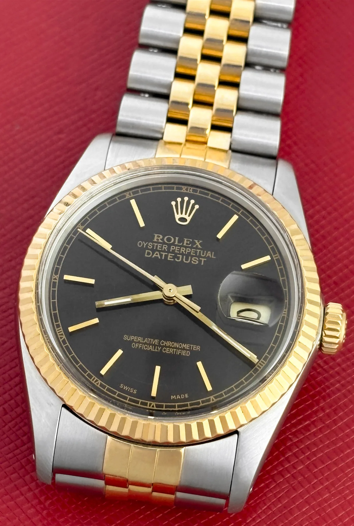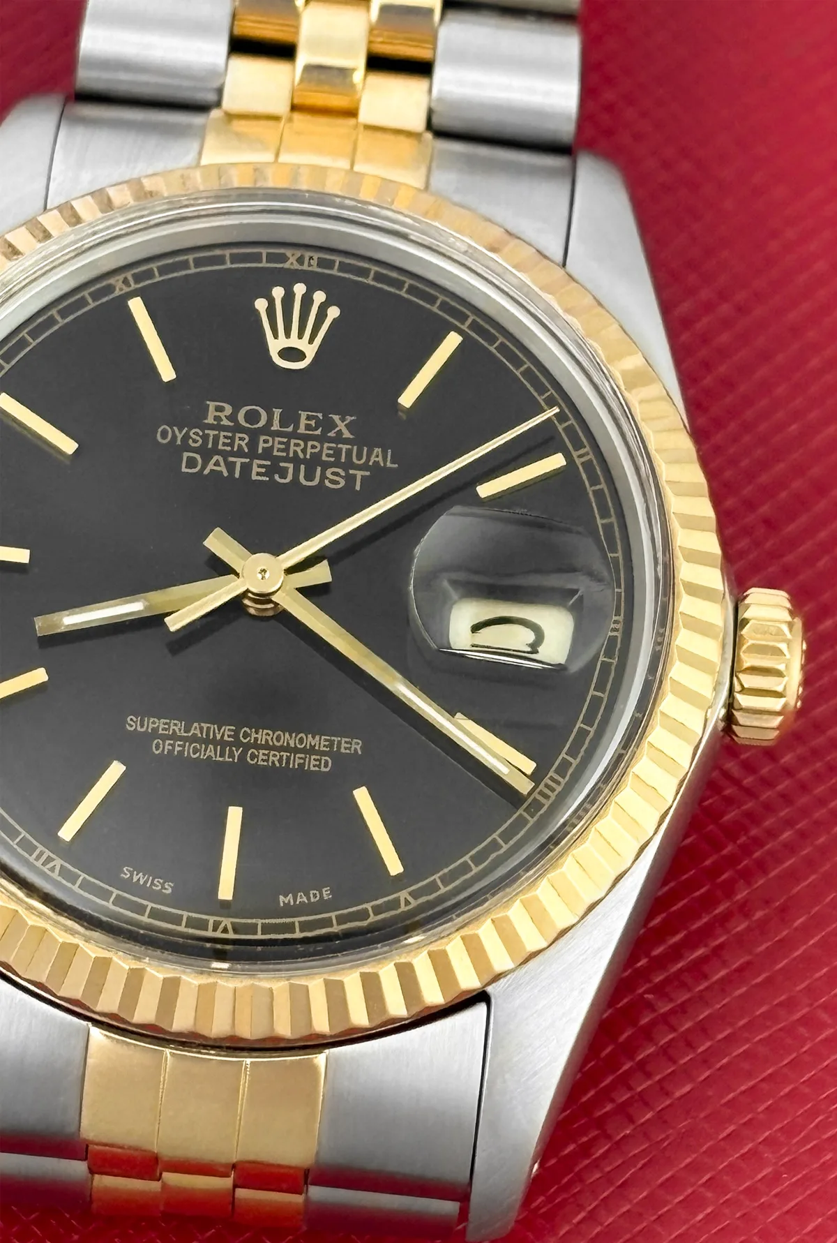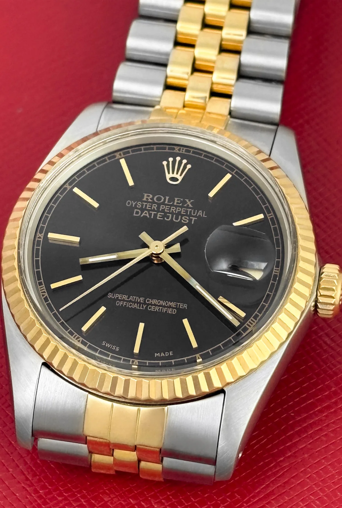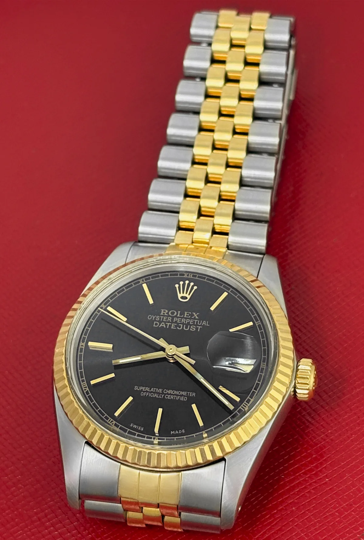 Case Material: Stainless Steel case with 18k Yellow Gold fluted bezel (36mm dia.)