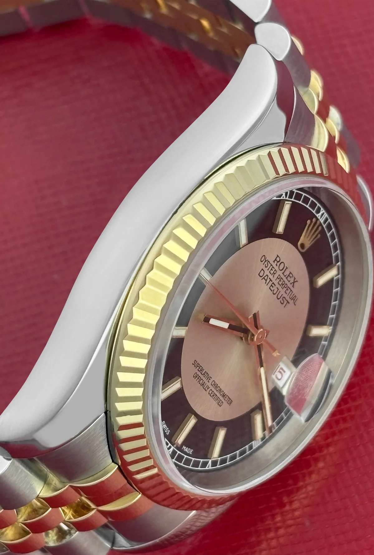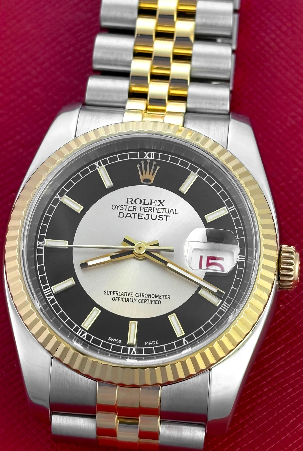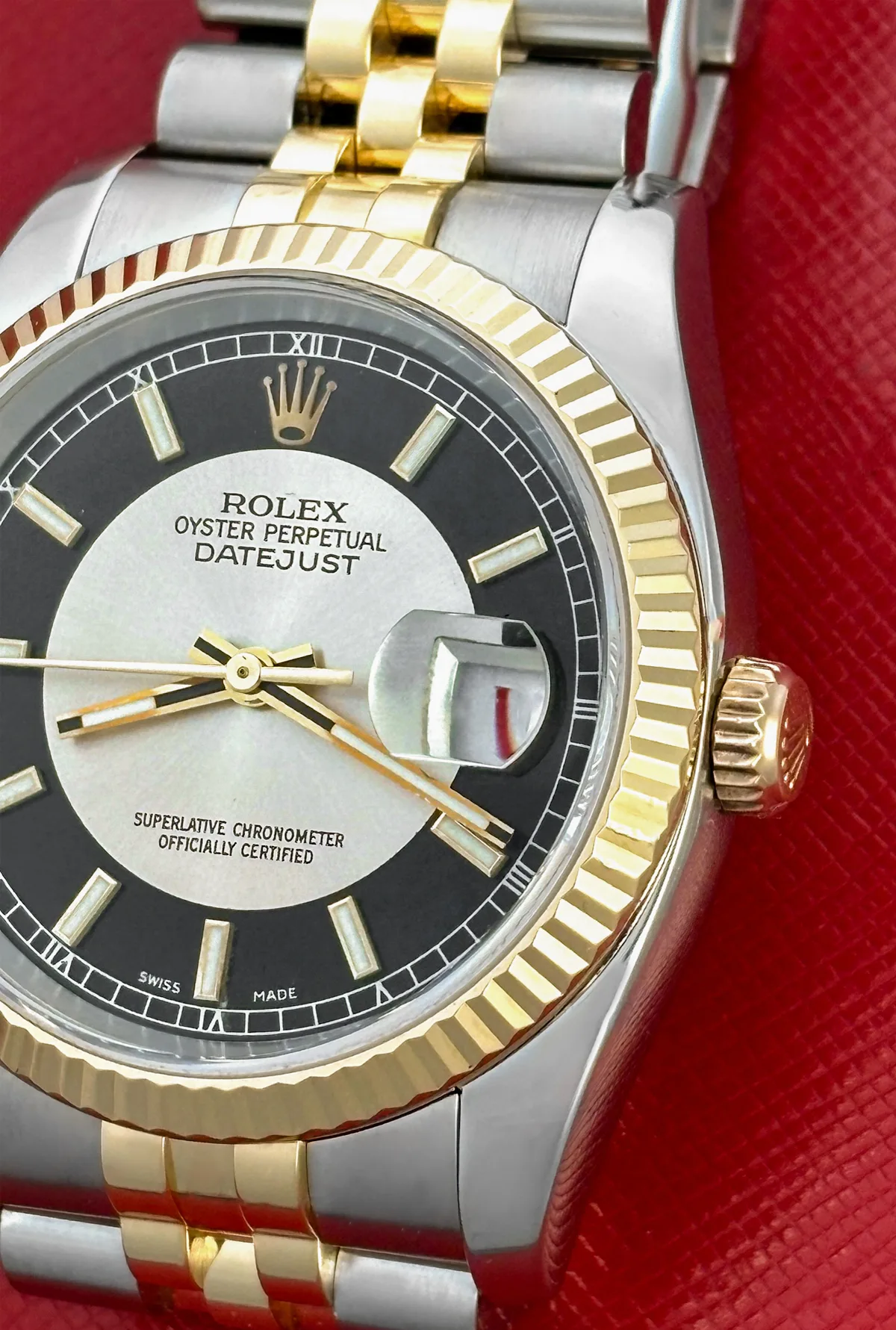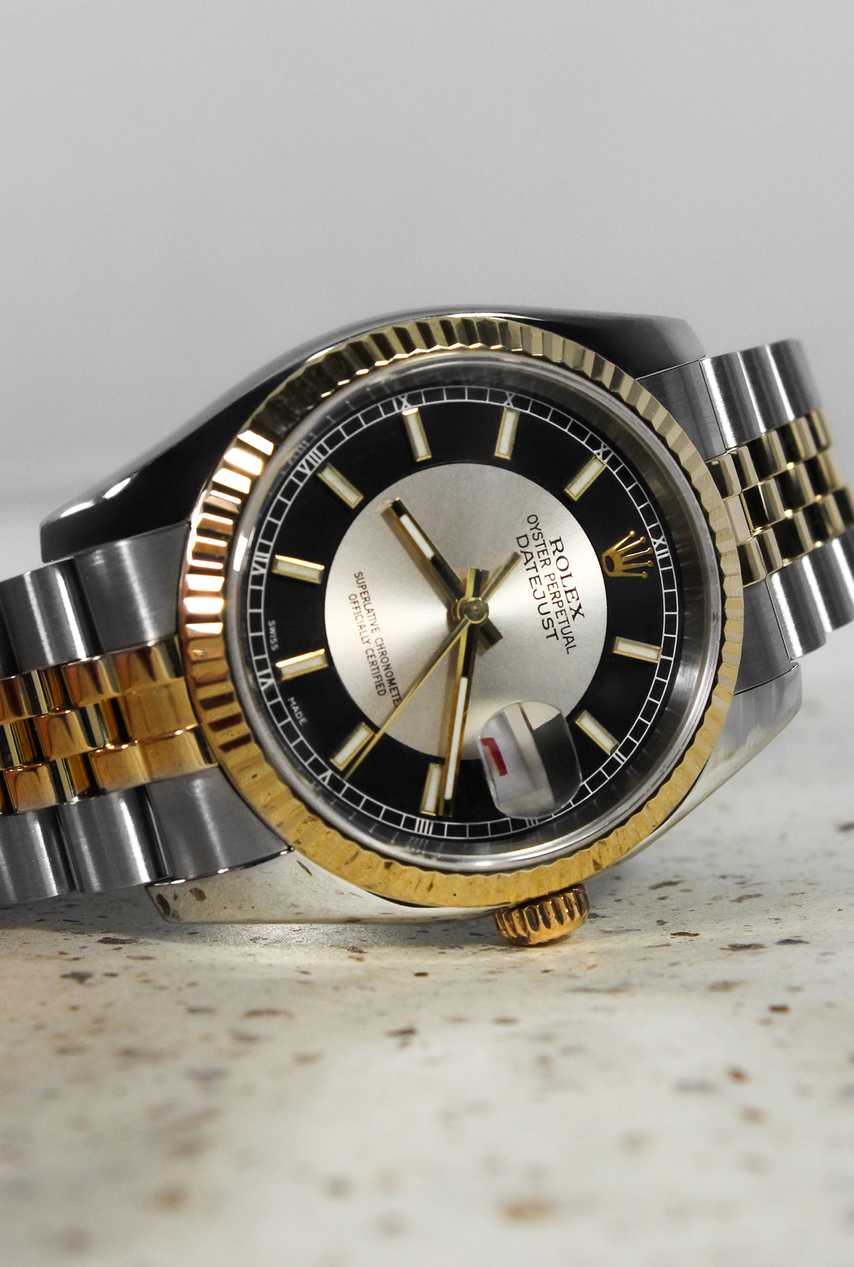 Case Material: Stainless Steel case with 18k Yellow Gold fluted bezel (36mm dia.)