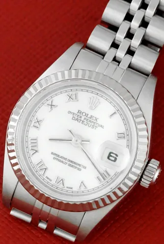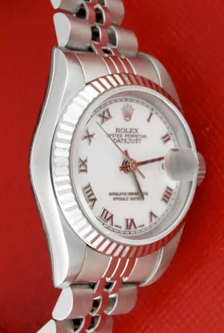 Case Material: Stainless Steel case with 18k White Gold fluted bezel (26mm dia.)