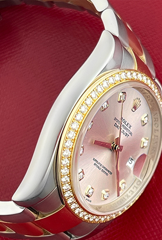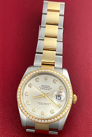 Case Material: Stainless Steel case with 18k Yellow Gold Rolex Diamond bezel (36mm dia.)