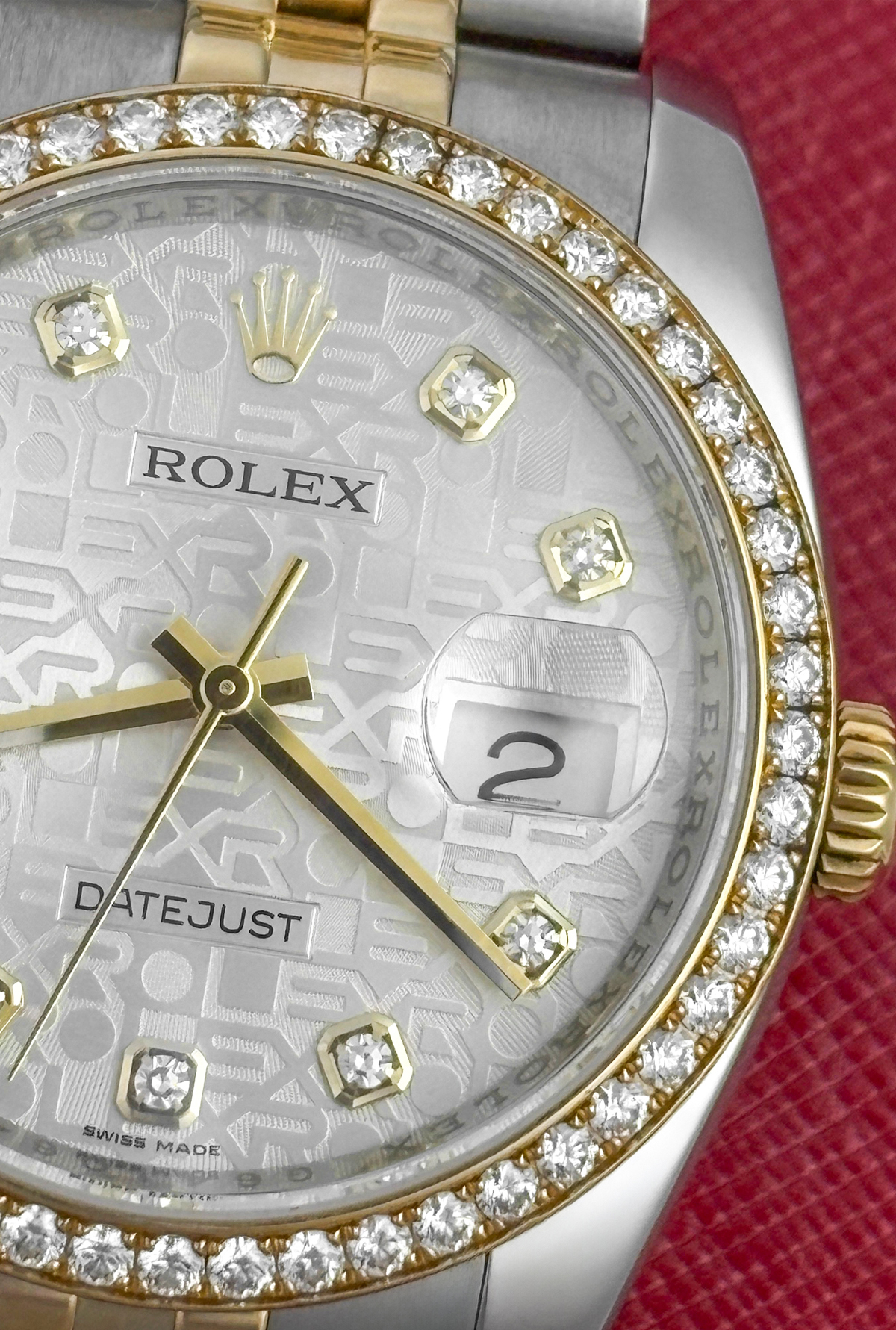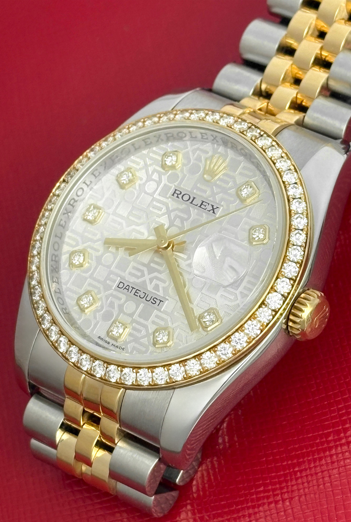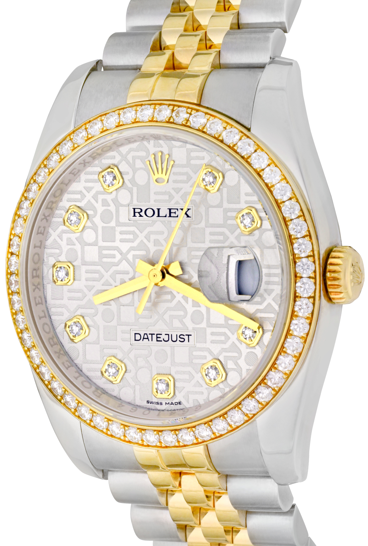 Case Material: Stainless Steel case with 18k Yellow Gold Rolex Diamond bezel (36mm dia.)