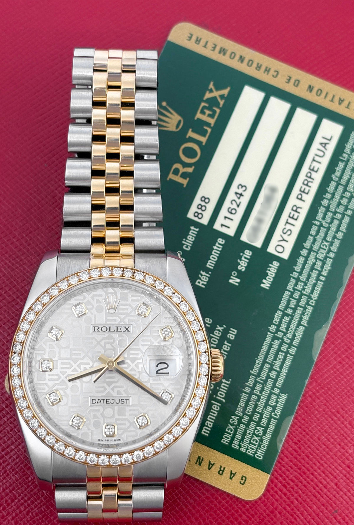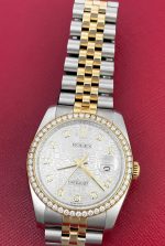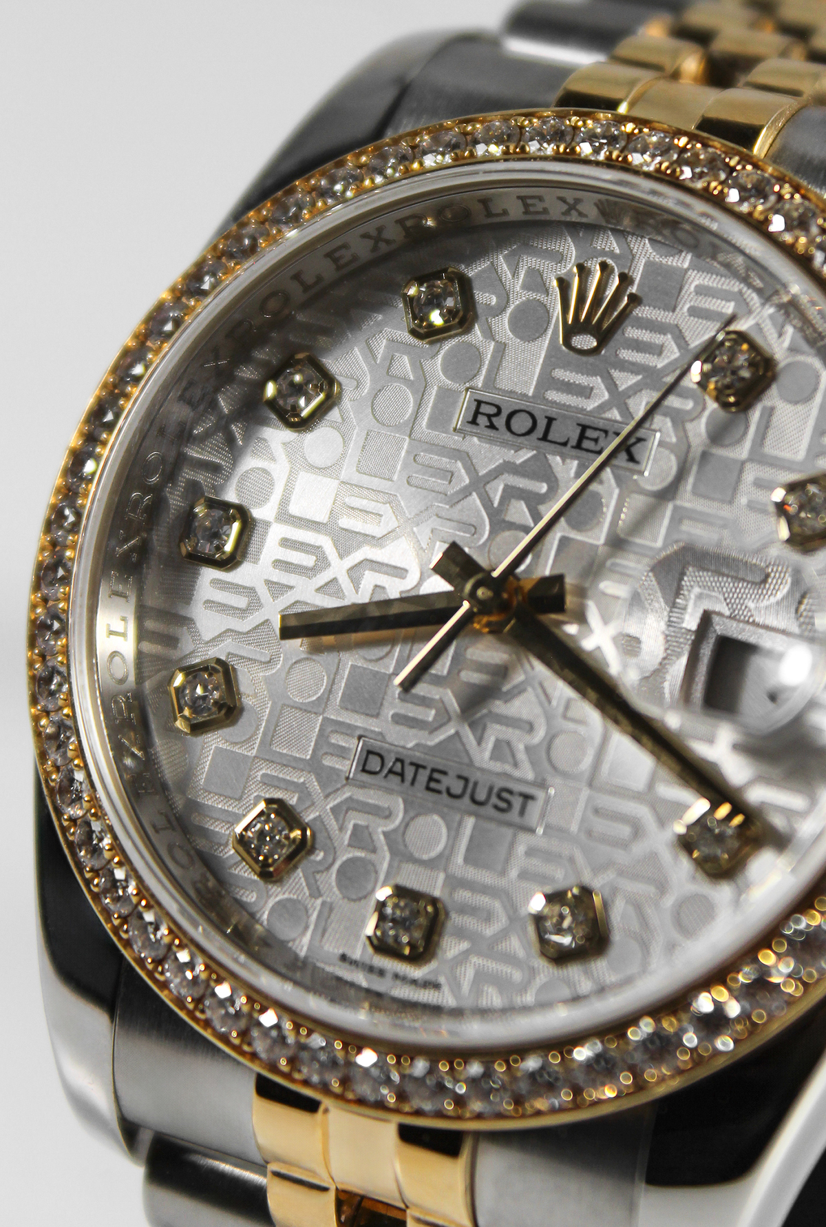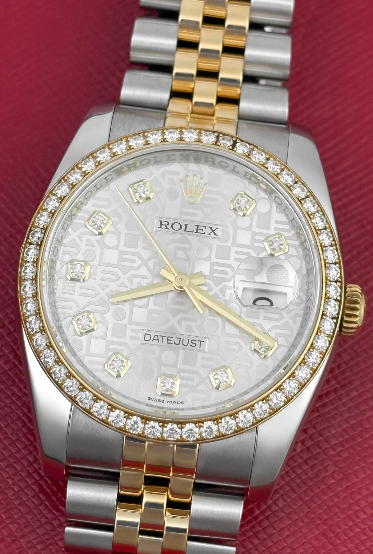 Case Material: Stainless Steel case with 18k Yellow Gold Rolex Diamond bezel (36mm dia.)