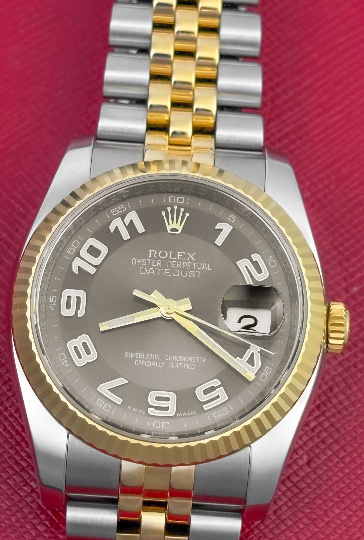 Case Material: Stainless Steel case with 18k Yellow Gold fluted bezel (36mm dia.)