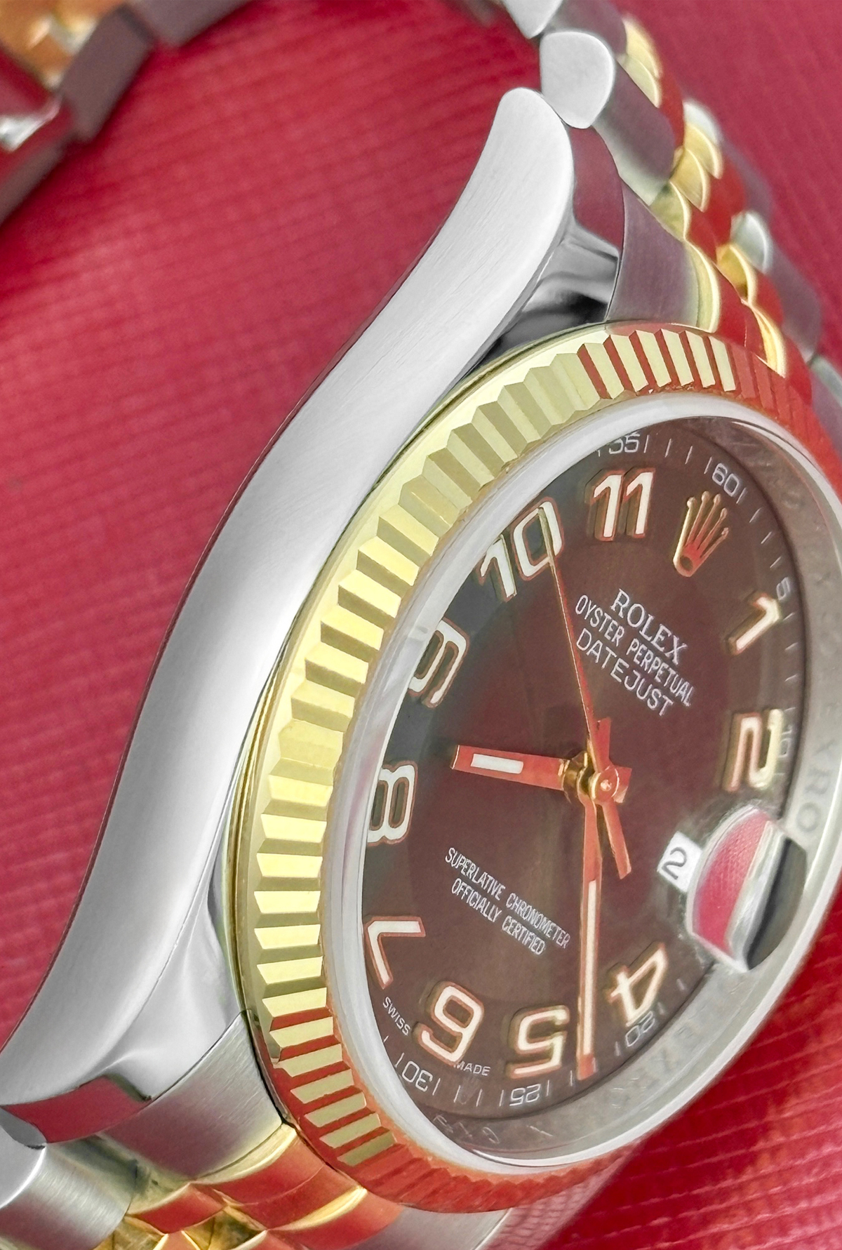 Dial: Tu-Tone chocolate Dial with luminous Arabic numerals