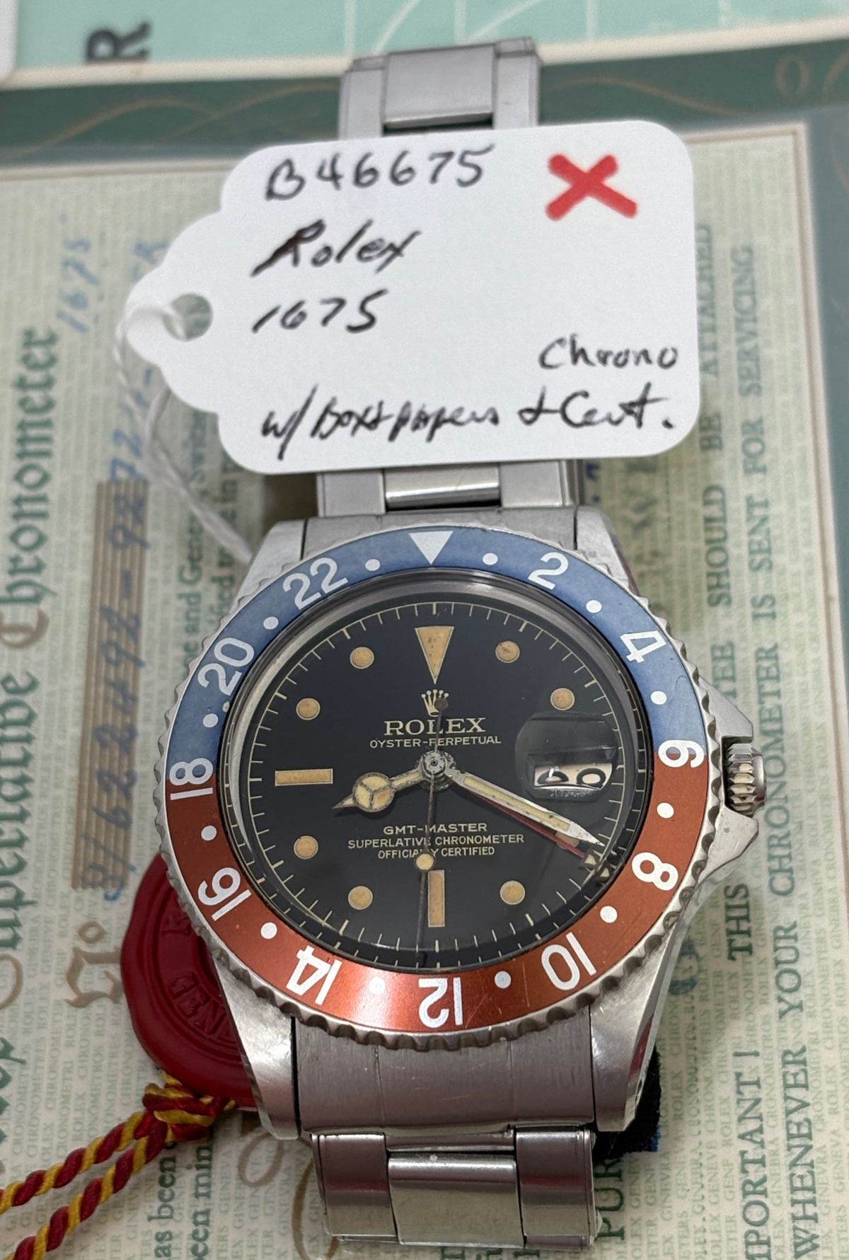 Additional Information: Original box, papers, GMT Booklet, Hang Tag, Green Plastic Warranty Folder, and Original Swiss Timing Certificate with match Movement Serial Number of Watch