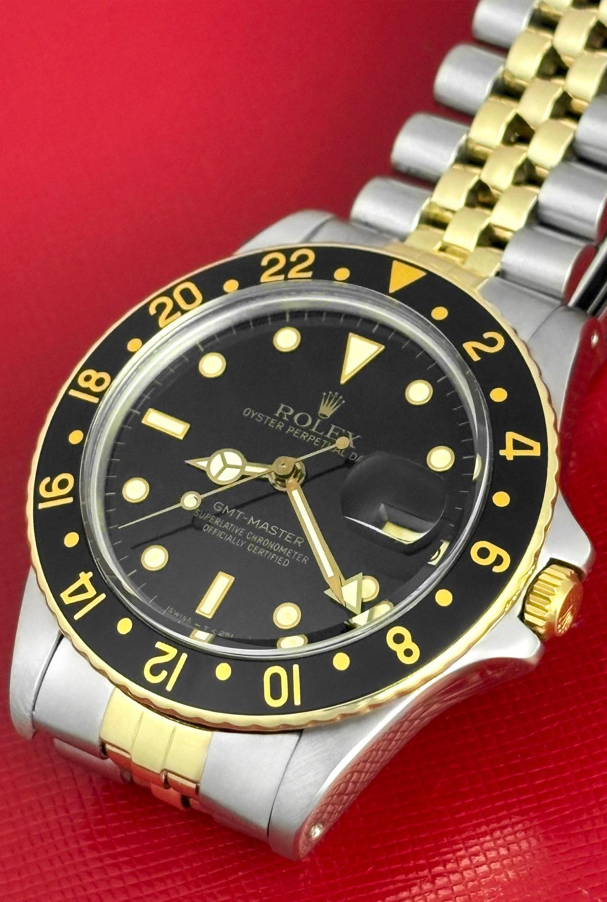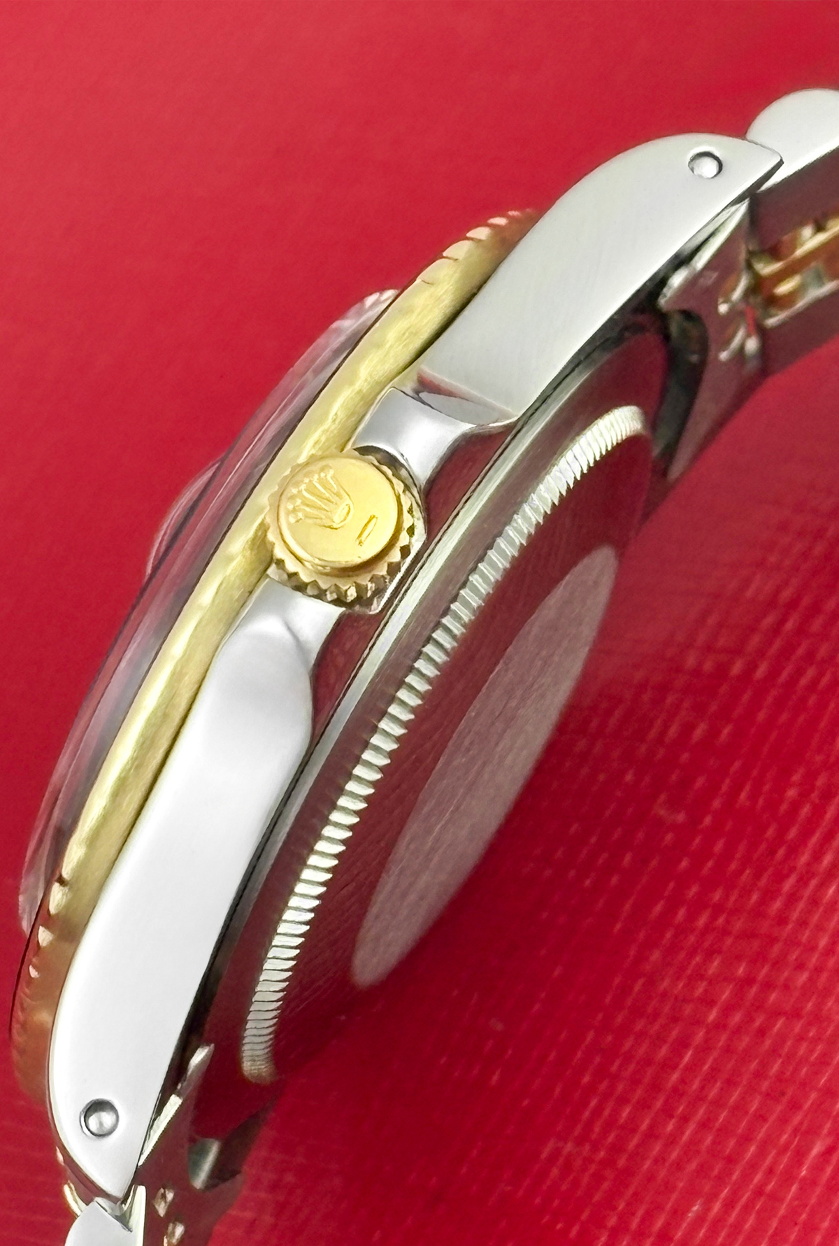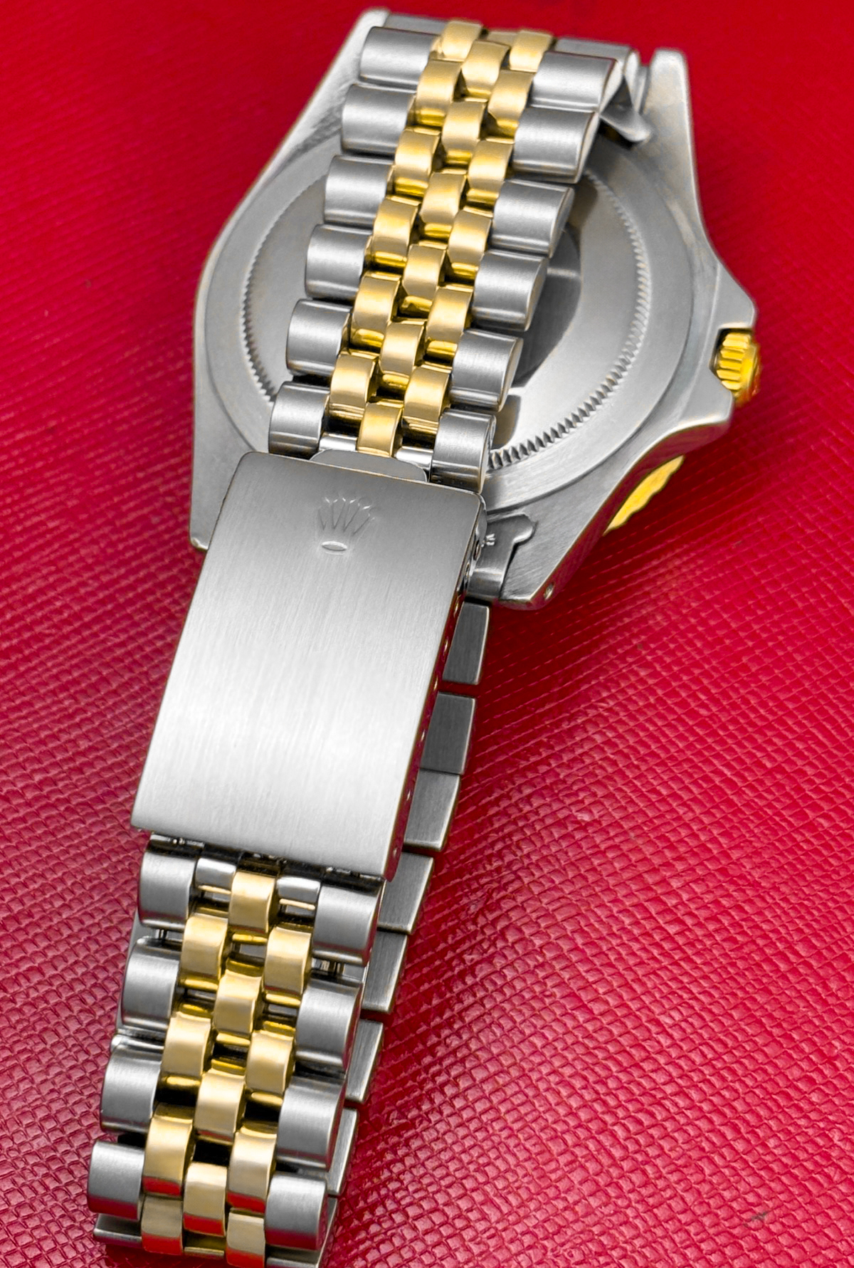 Case Material: Stainless Steel case with 14k Yellow Gold rotating bezel with Black insert (41mm dia.)