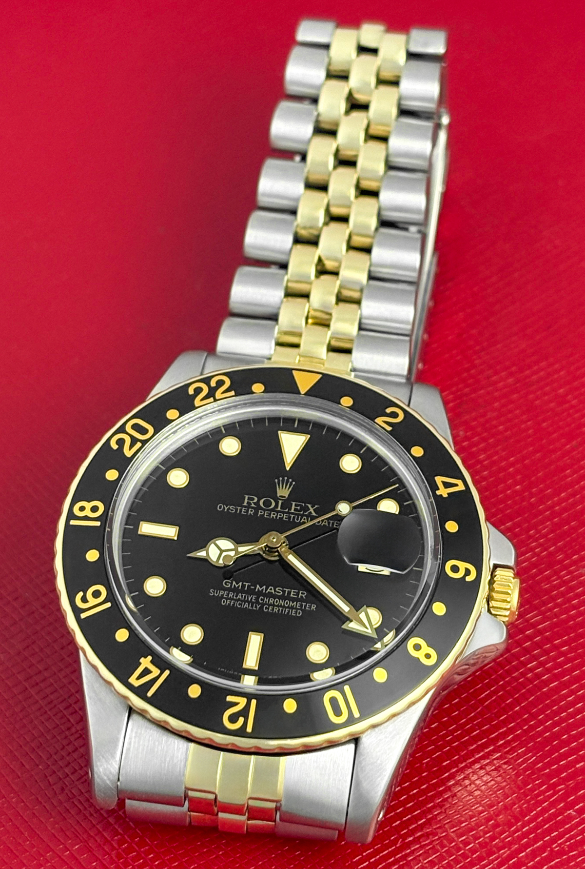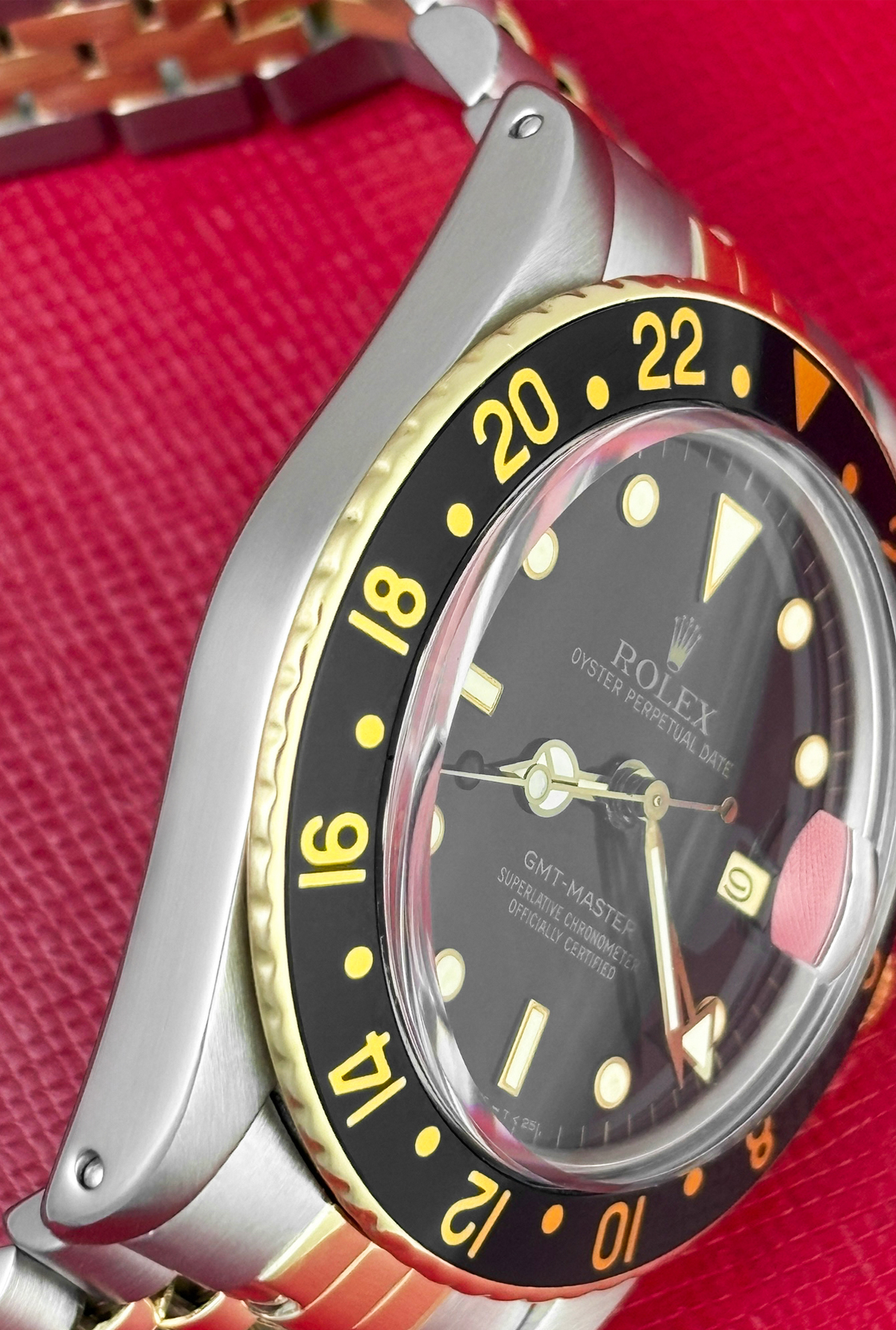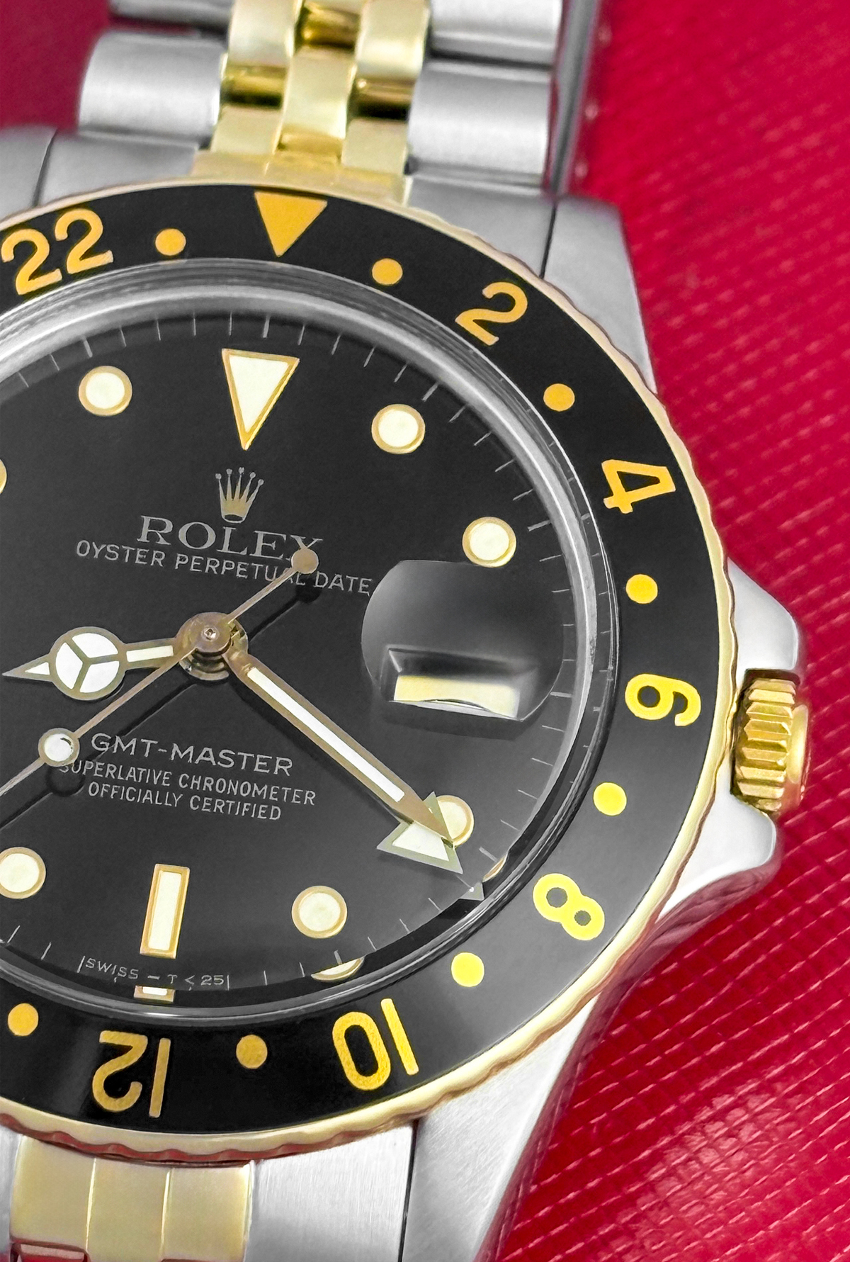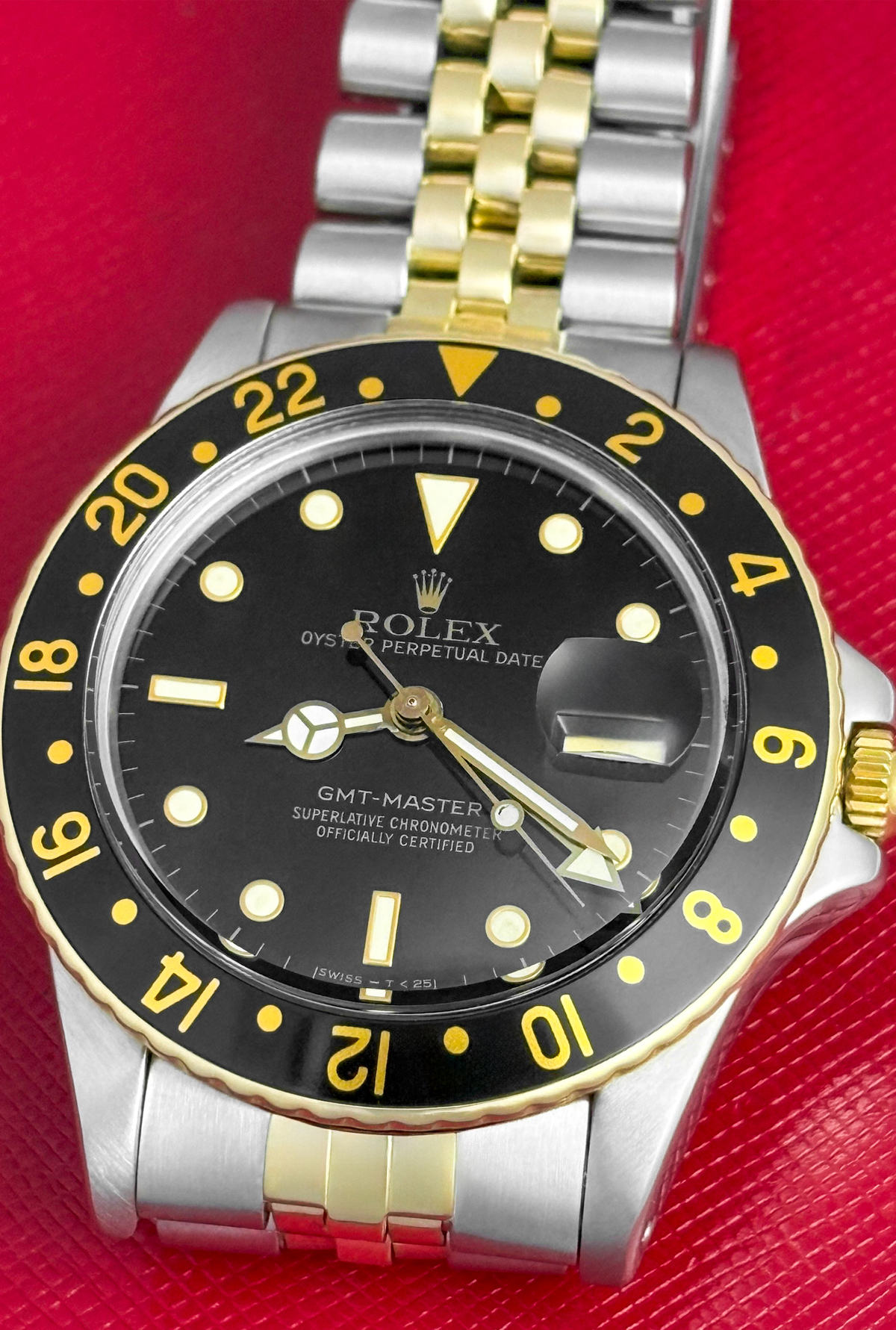 Case Material: Stainless Steel case with 14k Yellow Gold rotating bezel with Black insert (41mm dia.)