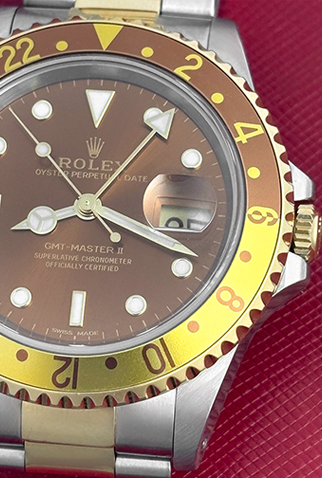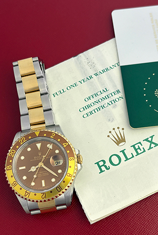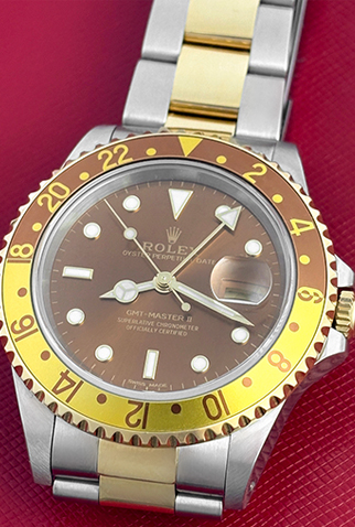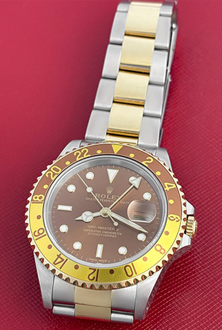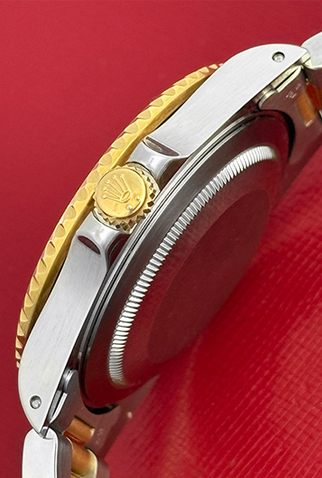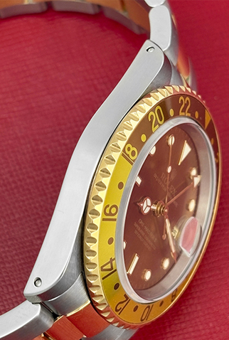 Case Material: Stainless Steel case with 18k Yellow Gold rotating bezel with Bronze insert (41mm dia.)