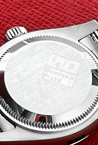 Case Material: Stainless Steel case with smooth domed bezel with Domino’s Pizza logo engraved on case back (26mm dia.)