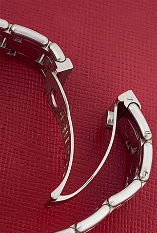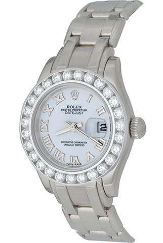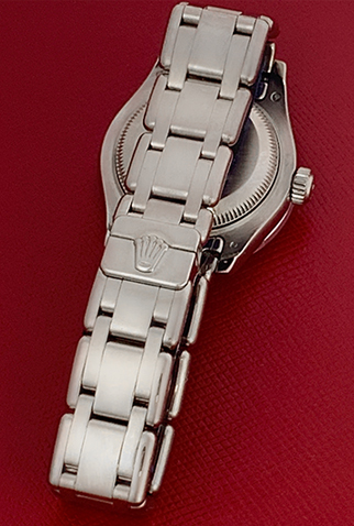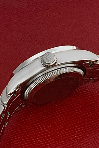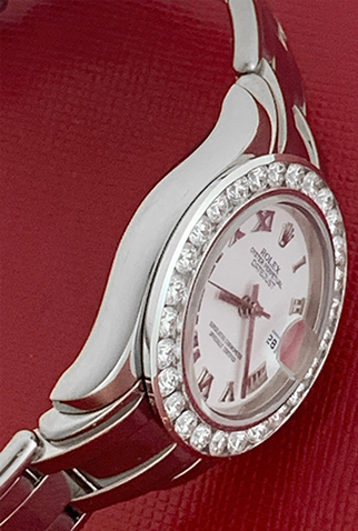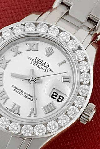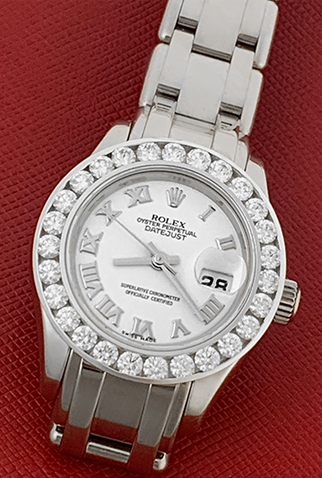 Case Material: 18k White Gold with custom 2.15 ct. channel set Diamond Bezel (28mm dia.)