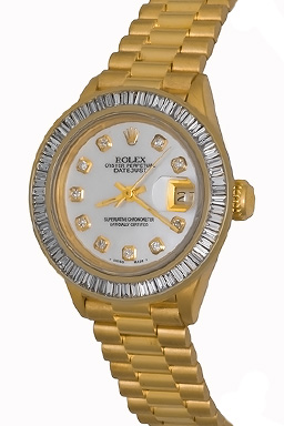 Case Material: 18k Yellow Gold case with beautiful custom 1.5 ct. channel set Baguette Diamond bezel (26mm dia.)