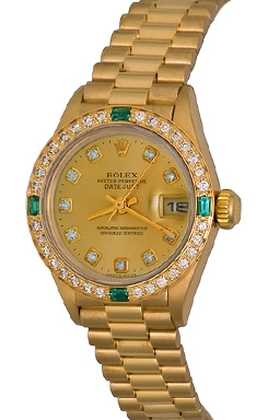 Case Material: 18k Yellow Gold case with custom Diamond and Emerald bezel (26mm dia.)