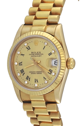 Dial: Champagne Dial with black Roman numerals and Rolex Diamonds set on outer edge