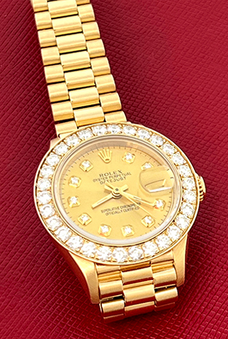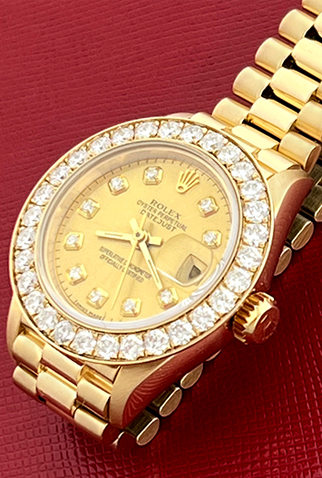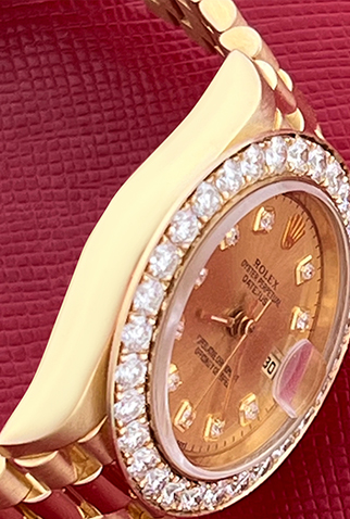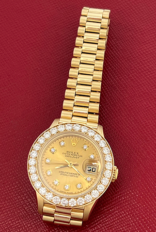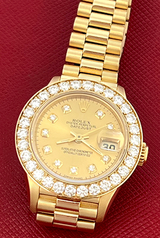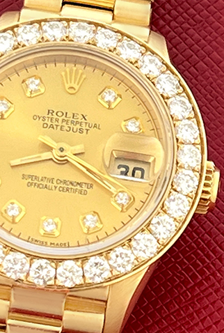Case Material: 18k Yellow Gold case with beautiful custom 2.15 ct. Diamond bezel (26mm dia.)