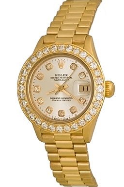 Case Material: 18k Yellow Gold case with custom 1.6 ct. Diamond bezel (26mm dia.)