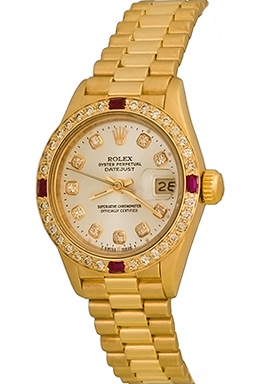 Case Material: 18k Yellow Gold case with custom Diamond and Ruby bezel (26mm dia.)