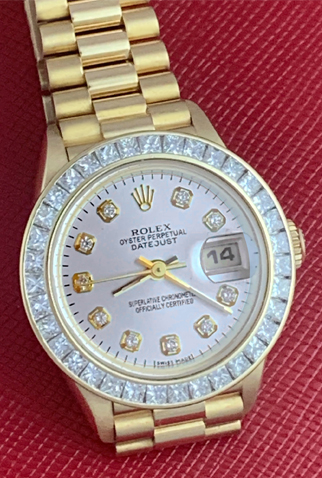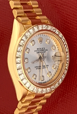 Case Material: 18k Yellow Gold case with beautiful custom 1.6 ct. Princess channel set Diamond bezel (26mm dia.)
