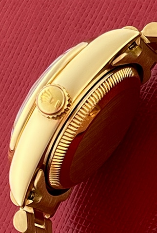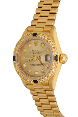 Case Material: 18k Yellow Gold case with custom Diamond and Sapphire bezel (26mm dia.)