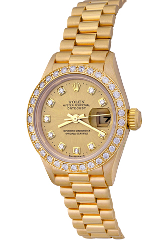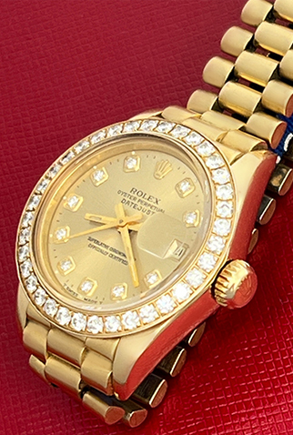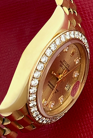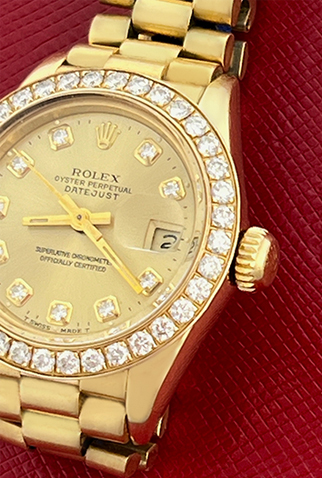 Case Material: 18K Yellow Gold case with custom Diamond bezel (26mm dia.)