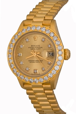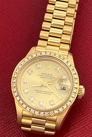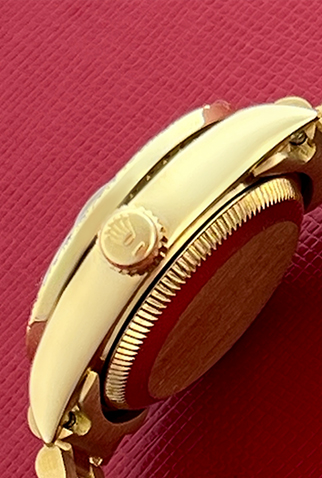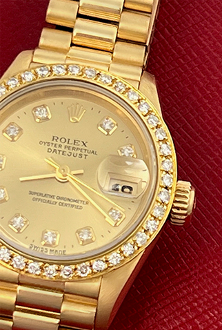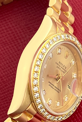 Case Material: 18k Yellow Gold case with custom 1.6 ct. Diamond bezel (26mm dia.)